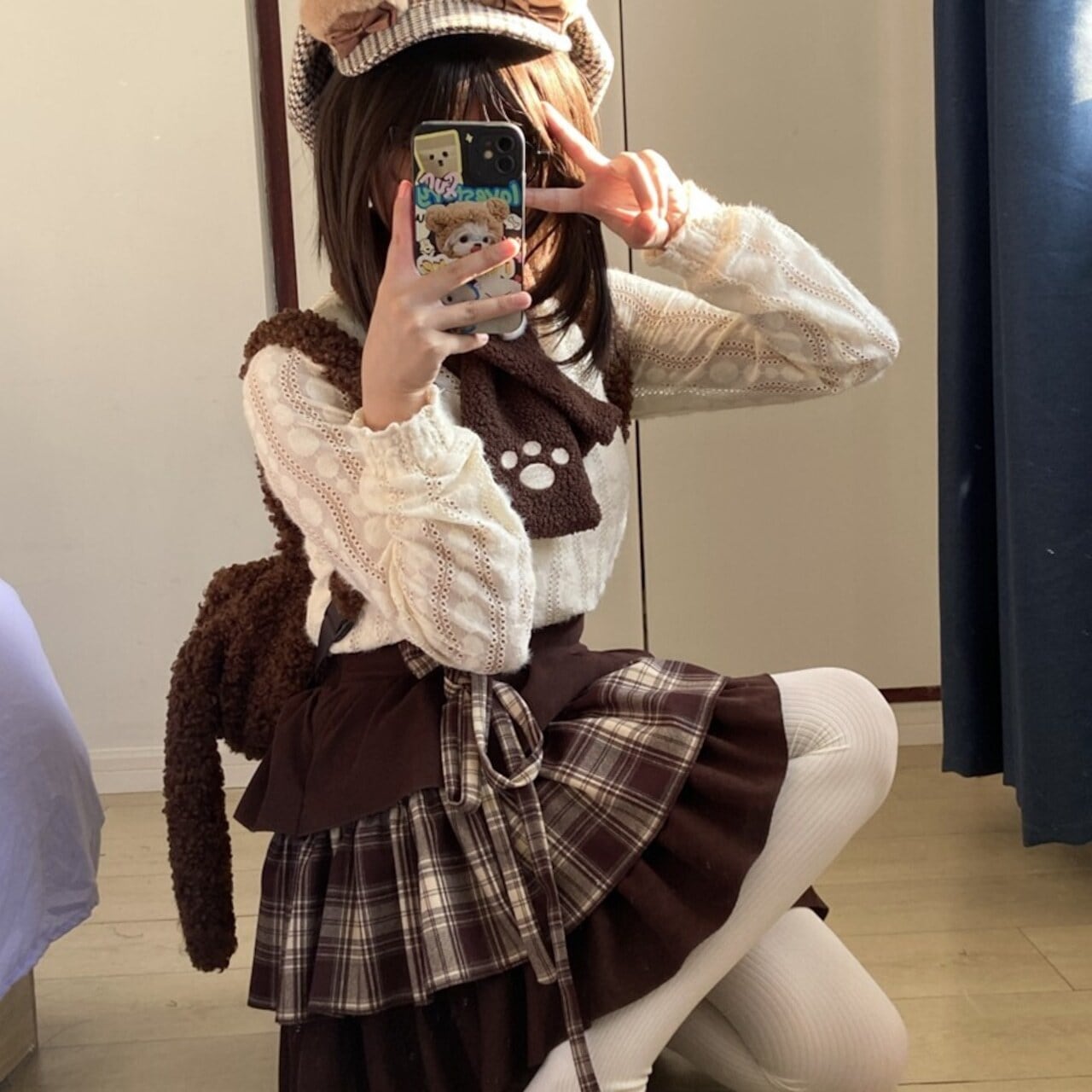 オフホワイトのケーブルニットが、暖かく優しい印象を与える長袖トップスです。細やかな縦の編み模様と、首元や袖口のフリル状の処理が、繊細で甘さを感じさせます。 スカートは、ブラウン系の色を基調としたチェック柄と無地のティアードデザイン。段になったフリルがふんわりと広がり、ボリュームのあるドーリーなシルエットを作り出しています。ウエストにあしらわれたリボンが、さらにガーリーな魅力を引き立てます。 全体的にショコラやミルクティーを思わせる温かみのあるブラウン系でまとめられており、甘くノスタルジックな雰囲気を演出します。 ◆商品の魅力、着用シーン 暖かみのある素材と、ブラウン系の落ち着いた色味が、秋冬のガーリー・ロリータスタイルにぴったりのセットアップです。 カジュアルなケーブルニットと、ふんわりとしたティアードスカートの組み合わせは、可愛らしさがありながらも気張りすぎない印象に。 友達とのカフェ巡り、ショッピング、秋の散策など、日常のお出かけに最適です。 モデルの着用のようにお揃いの色味のくまのモチーフが付いたマフラーや、アニマルモチーフの小物、ベレー帽などを合わせると、さらに統一感のあるキュートなスタイルが完成します。 ◆種類 セットアップ(トップス・スカート) ◎このような方におすすめ 甘いガーリースタイルが好きな方 ロリータファッションを日常的に楽しみたい方 ブラウン、ベージュ、オフホワイトなど温かい色合いの洋服が好きな方 関連キーワード: #ロリータ #ガーリー #セットアップ #ケーブルニット #ティアードスカート #ブラウン #チェック柄 #カフェモカ #可愛い #ドーリー ◆サイズ(cm) トップス Sサイズ 着丈57 胸囲88 肩幅36 袖丈63 Mサイズ 着丈58 胸囲92 肩幅37 袖丈64 Lサイズ 着丈59 胸囲96 肩幅38 袖丈65 XLサイズ 着丈60 胸囲100 肩幅39 袖丈66 スカート Sサイズ ウエスト58-68 Mサイズ ウエスト68-78 Lサイズ ウエスト78-88 ※メーカー採寸により、実際のサイズ、デザイン、色合いとは異なる場合がございます。なお、海外商品につき、商品によって寸法に多少のバラつきがあることがございます。予めご了承下さいませ。 ◆カラー(写真参照) オフホワイト/ブラウン ◆素材 ポリエステル混紡 ◆商品管理番号 V2510037 【ご購入前にご確認ください】 ・即納:2〜5営業日以内に発送 ・お取り寄せ:14〜30営業日前後で発送 ・受注生産:1か月〜4か月程度で発送 ・ご購入前にサイズ表を必ずご確認ください ・不良、破損は到着後5日以内にご連絡ください ・お客様都合の返品、キャンセルはお受けしておりません 詳細はショップFAQをご確認ください。 https://alicestyle.base.shop/blog/2026/01/27/140125