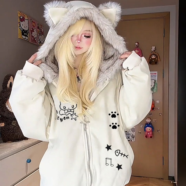 ボリューム感たっぷりのフェイクファーがあしらわれたネコ耳フードが、抜群のインパクトを放つジップアップジャケットです。 ストリート感のあるカジュアルなジャケットに、胸元のゆるかわいいキャラクター刺繍や、遊び心のある肉球・お魚の骨のプリントがポップなアクセントを加えています。 ドロップショルダーのゆったりとしたシルエットで、こなれ感のある着こなしが楽しめます。 ◆商品の魅力 羽織るだけでコーディネートの主役になる、甘さとクールさを兼ね備えた一着。 サブカルチャーやストリートファッションにおいて、自分らしさを表現したい方にぴったりのアイテムです。 ◆種類 ジャケット ◎このような方におすすめ サブカル、地雷系、ストリートファッションが好きな方 猫モチーフのアイテムが好きな方 個性的でインパクトのあるアウターを探している方 関連キーワード: #サブカル #地雷系 #ストリートファッション #アメカジ #ネコ耳 #ファージャケット #フーディー #アウター #個性的 #Y2K #かわいい #オーバーサイズ ◆サイズ(cm) Mサイズ 着丈68 胸囲118 肩幅54 袖丈57 Lサイズ 着丈70 胸囲122 肩幅56 袖丈58 XLサイズ 着丈72 胸囲126 肩幅58 袖丈59 2XLサイズ 着丈74 胸囲130 肩幅60 袖丈60 ※メーカー採寸により、実際のサイズ、デザイン、色合いとは異なる場合がございます。なお、海外商品につき、商品によって寸法に多少のバラつきがあることがございます。予めご了承下さいませ。 ◆カラー(写真参照) ブラック ベージュ ◆素材 ポリエステル混紡 ◆商品管理番号 YU2510098 【Alice styleトップページ】 https://alicestyle.base.shop/ 【ご注文の前に】 ご注文に関して、下記のご注文、お届けに関する詳細をご覧の上、ご注文下さいませ 【aboutページ】 https://alicestyle.base.shop/about 【Alice styleコンセプト】 Alice style は「物語を纏う」をテーマにしたロリィタファッション専門の通販ショップです。 甘ロリ・ゴシックロリィタ・クラシカルロリィタ・中華ロリ・和ロリ・王子系・軍服ロリィタ・パンク/スチームパンク・アイドル衣装・コンカフェ服まで、幅広いジャンルをラインナップ。初心者から上級者まで、あなたの“可愛い”を叶える1着が必ず見つかります。 【納期について】 ・即納商品は注文から2日から5営業日以内に発送 ・海外お取り寄せ商品は商品メーカーにより出荷日数が異なります。その為、営業日14日から30日程度で発送致します。 ・受注生産商品(受注予約商品)の場合は1か月から4か月程度の納期となります。 【キャンセル・返品ポリシー】 ・注文後のサイズ変更は対応できないことが多いため、ご購入前にサイズ表をご確認ください ・不良品・破損品の場合は到着後7日以内にご連絡ください。交換または返金対応 ・お客様都合による返品には対応しておりません。(詳細はご利用規約をご覧ください) Alice style は安心してお買い物ができる環境を提供します。SNS・ブログでコーデや新作情報を発信中。ぜひフォローして最新情報をチェックしてください。