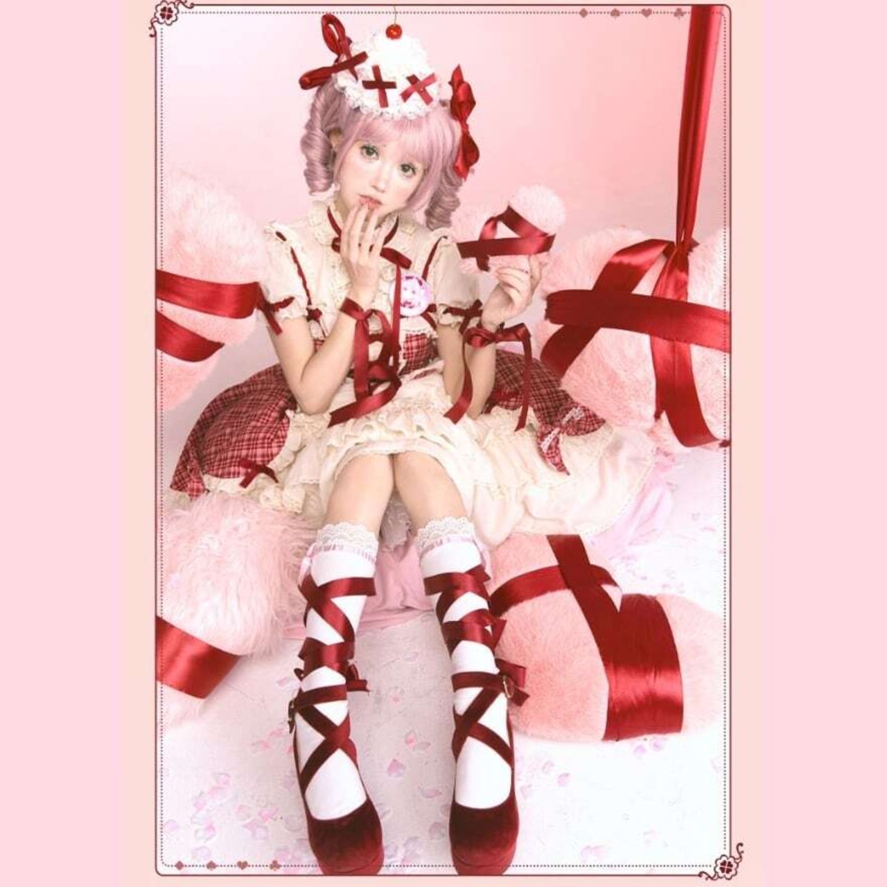 ご紹介するブラウスはパフスリーブの袖口にもフリルが施され、全体に甘く柔らかな雰囲気でジャンパースカートは、赤と黒のチェック柄が目を引く、パンクテイストもミックスされたアイドルロリィタスタイルです。