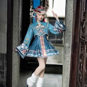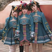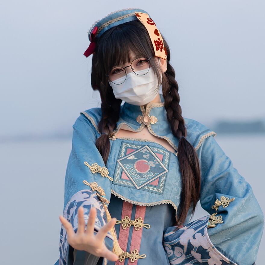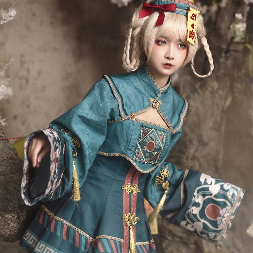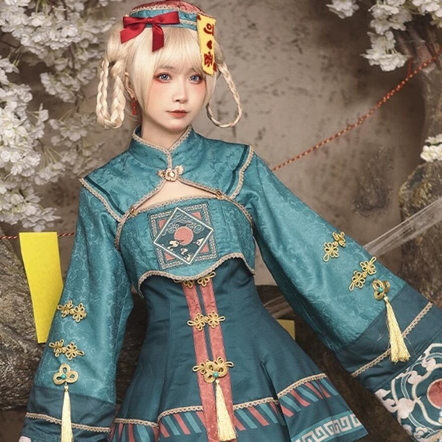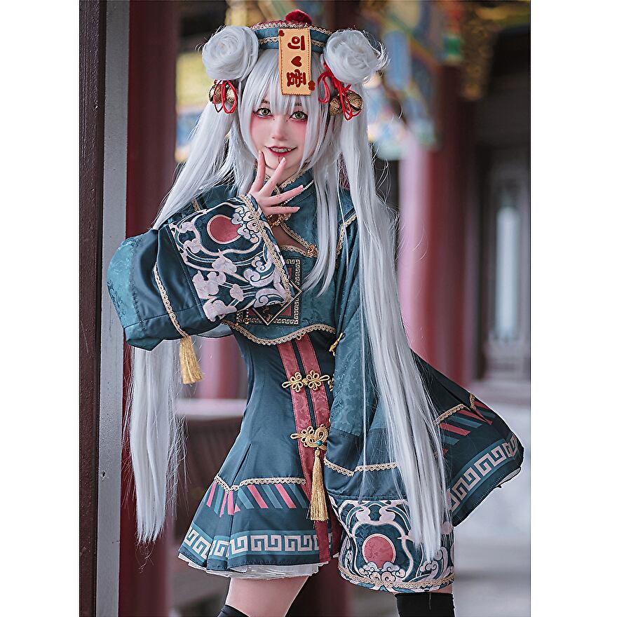 トランペットスリーブとプリーツスカートが女性らしい印象を与える一方、キョンシーを彷彿とさせるデザインにはゆめかわな装飾が施されており、かわいらしさと不思議さを併せ持っています。
