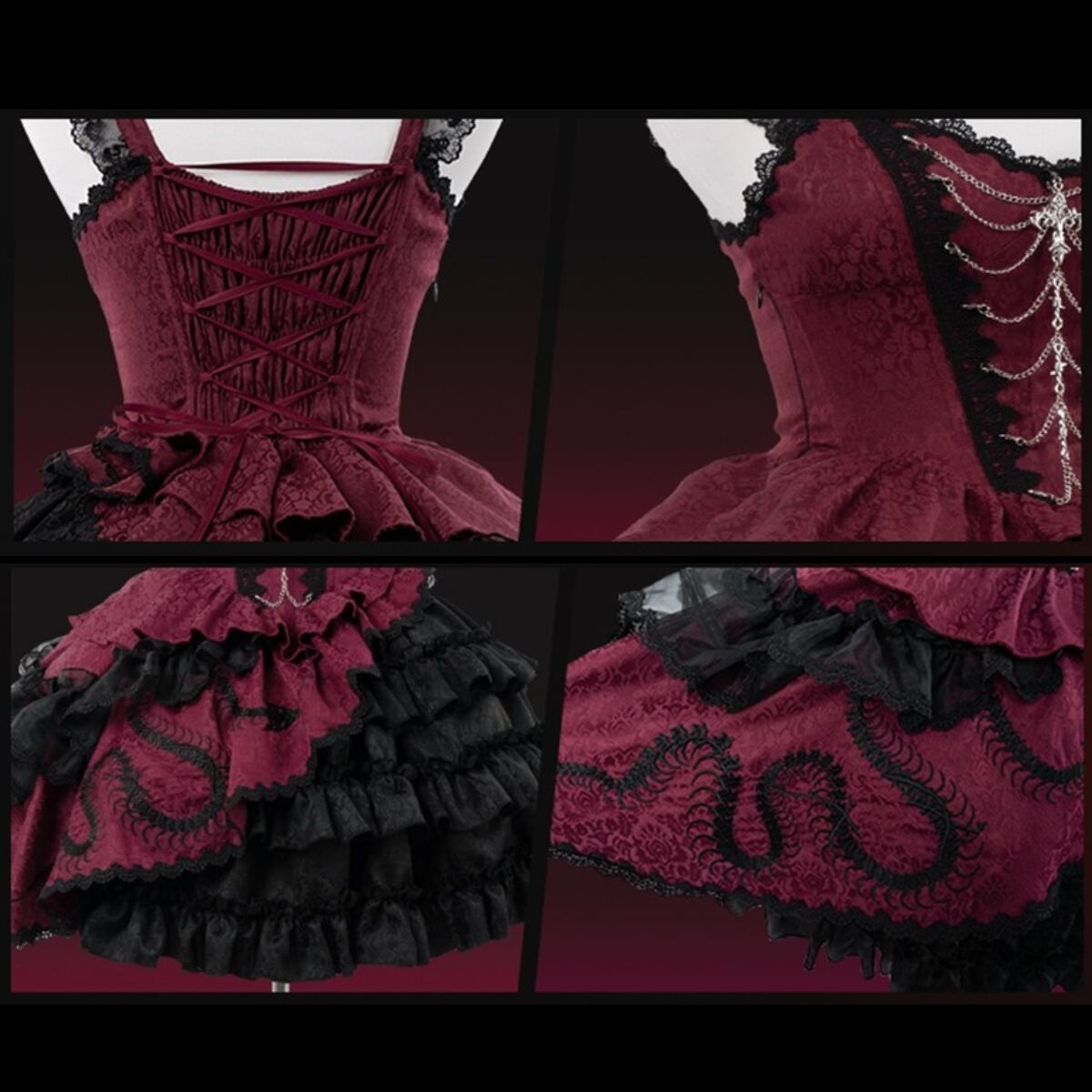 深みのあるワインレッドと漆黒のブラックの生地に、レースやフリル、チェーンがふんだんにあしらわれた、ゴスロリのジャンパースカートです。