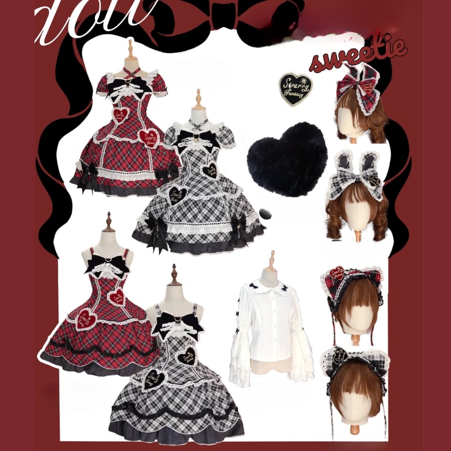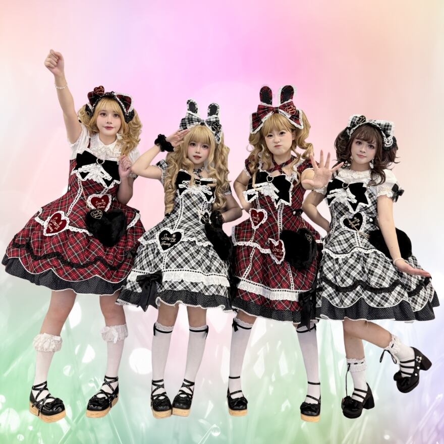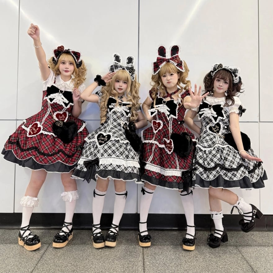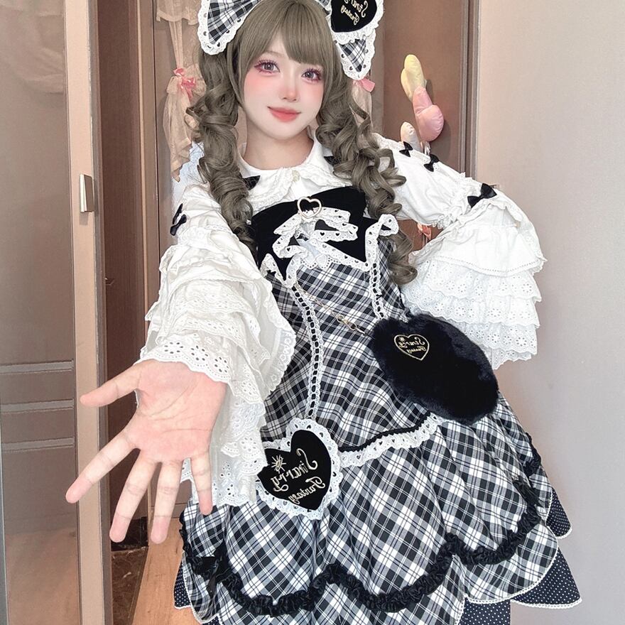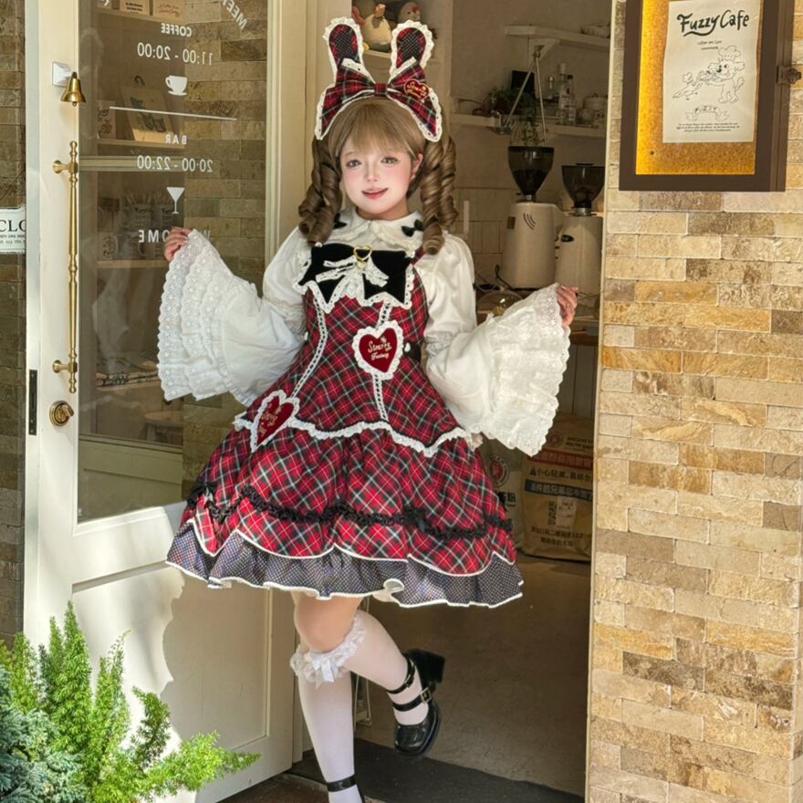 赤と黒のチェック柄、またはモノトーンのチェック柄を基調とした、可愛らしい甘ロリファッションのセットアップです。大きなリボンが付いたカチューシャと、たっぷりのフリルがついた姫袖のブラウス、そしてハートのモチーフが愛らしいジャンパースカートがセットになっています。