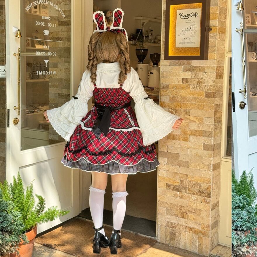 甘くてキュートなデザインが魅力のセットアップです。カチューシャやブラウス、ジャンパースカートを組み合わせることで、全身をトータルコーディネートできます。赤と黒のチェック柄はポップで元気な雰囲気を、モノトーンのチェック柄は少しシックで大人っぽい甘さを演出します。