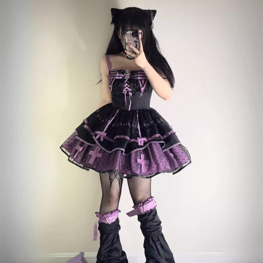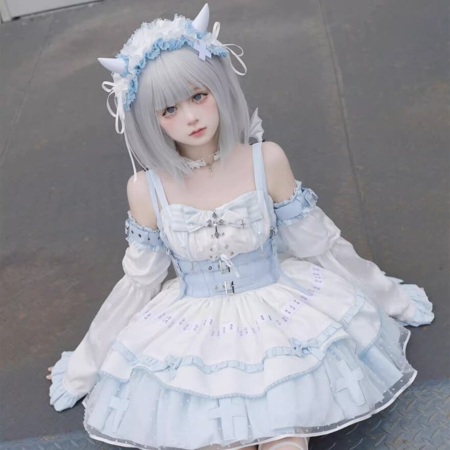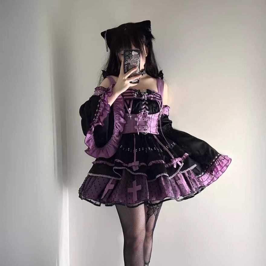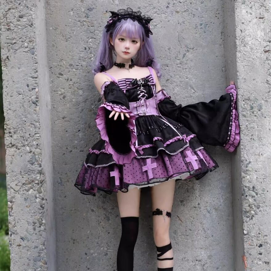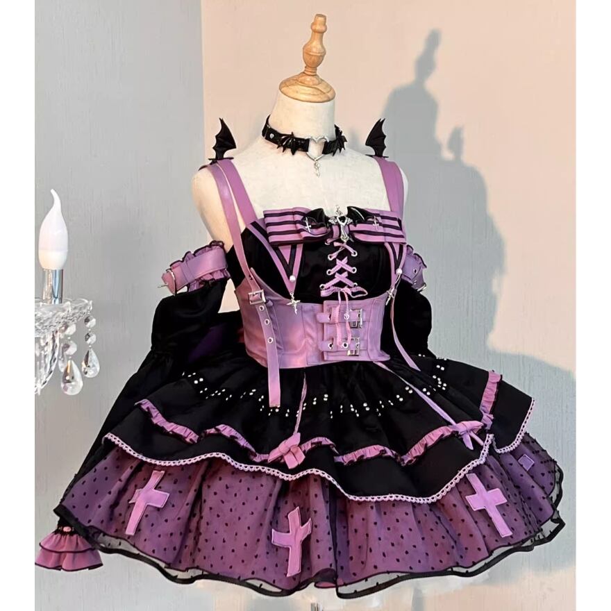 ふわふわレイヤードのミニスカートにゴシックな十字架をあしらい、姫袖にバックリボン、チョーカーまで付いたオールインワンです。