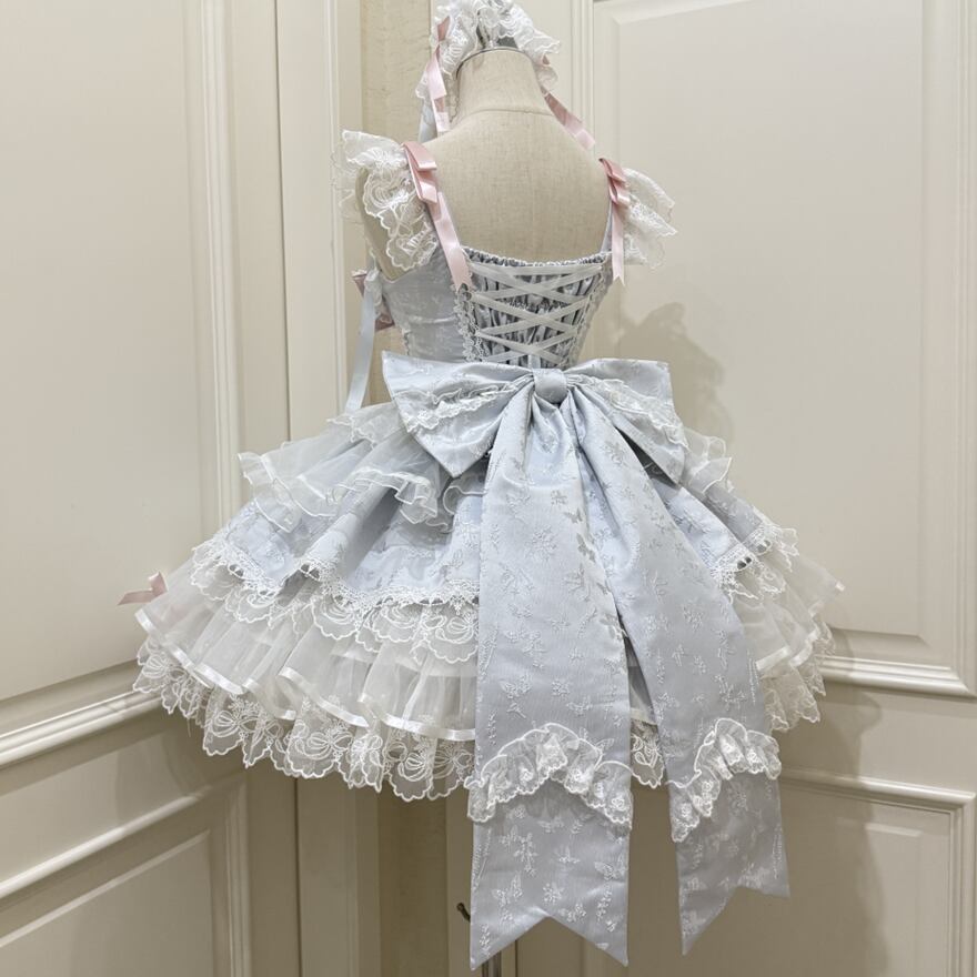 ふんわりと広がるティアードスカートのシルエットと、胸元や肩紐にあしらわれたリボンが、可憐でドーリーな印象を与えます。