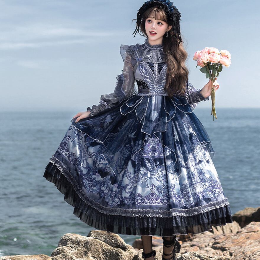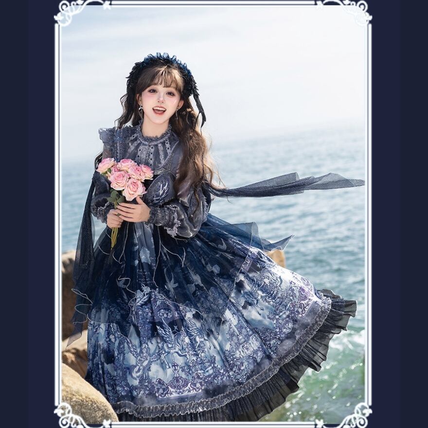 深いネイビーとホワイトのグラデーションが美しい、クラシカルなロリータファッションのセットアップです。シースルーのブラウスと、繊細なプリントが施されたJSK(ジャンパースカート)、そしてその上に重ねるシフォンレイヤーが、幻想的でエレガントな雰囲気を醸し出しています。