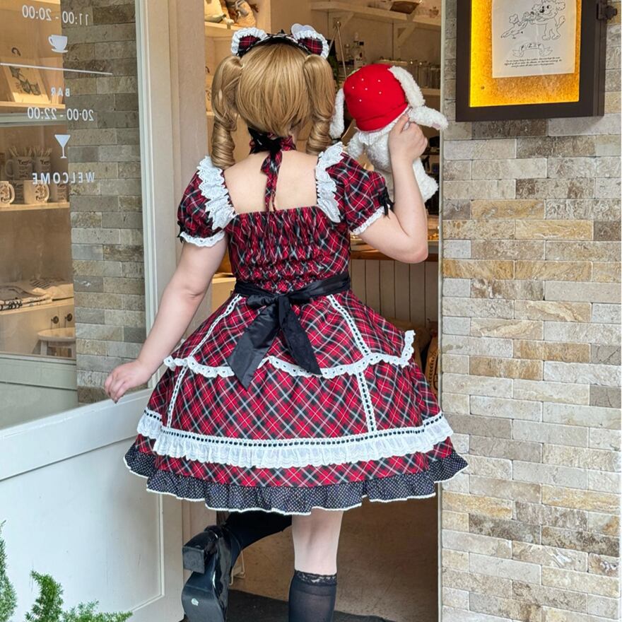 甘くてキュートなデザインが魅力のセットアップです。カチューシャやブラウス、ワンピースを組み合わせることで、全身をトータルコーディネートできます。赤と黒のチェック柄はポップで元気な雰囲気を、モノトーンのチェック柄は少しシックで大人っぽい甘さを演出します。