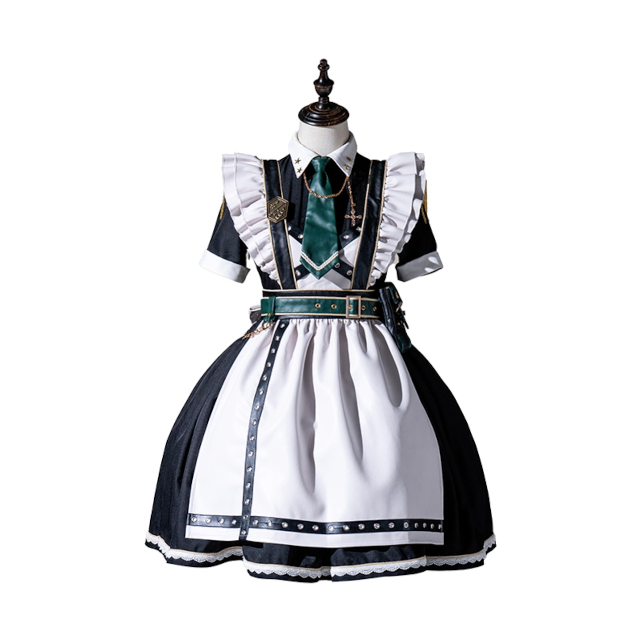 クラシカルなメイド服をベースに、ハーネス風の胸当てやスタッズ付きのベルトで、ミリタリーとパンクのエッセンスを大胆に注入しました。