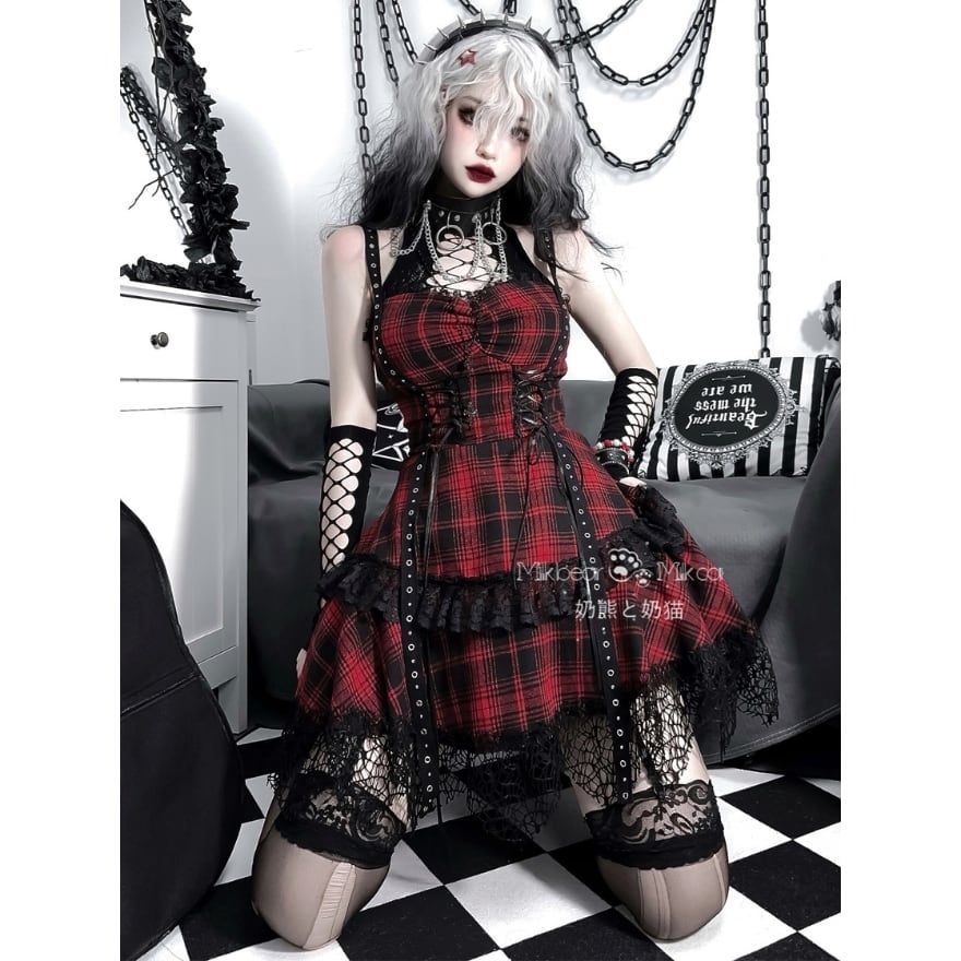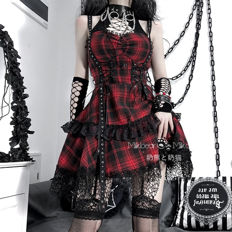 王道の赤×黒タータンチェックに、黒レースと編み上げを組み合わせた最強のデザイン。フィッシュネットやクロスストラップが、パンクで退廃的な雰囲気を加速させます。