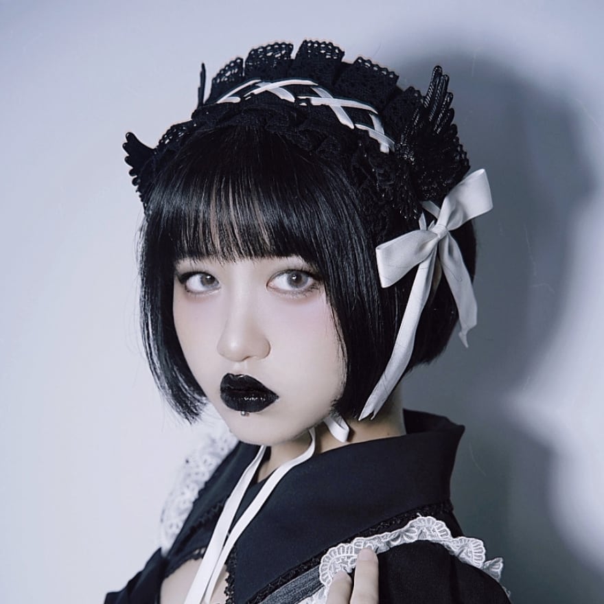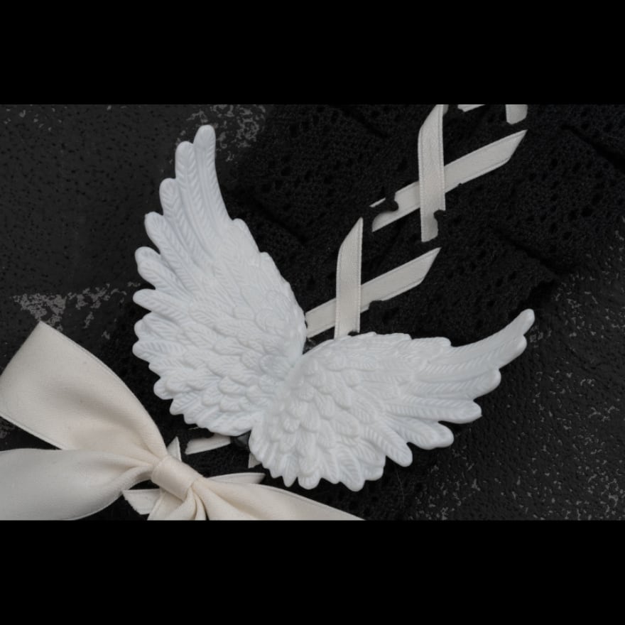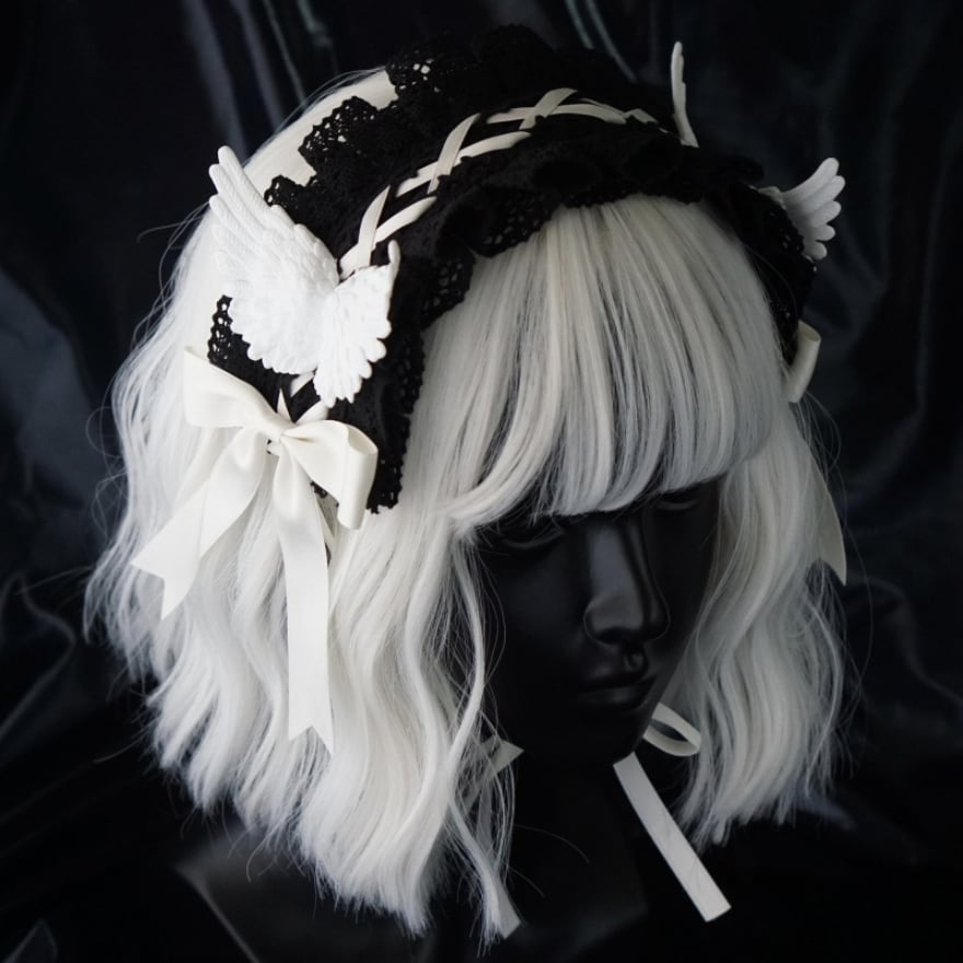 重厚なブラックレースと、純真なホワイトのリボンが織りなす繊細なデザイン。両サイドには、今にも羽ばたきそうな小さな天使の羽根があしらわれ、どこか儚げな雰囲気を漂わせます。ヘッドドレスを身につけるだけで、あなたの表情に神秘的なオーラが宿り、甘くもダークな世界観を完成させる、まさに地雷系ファッションの決定版アイテムです。