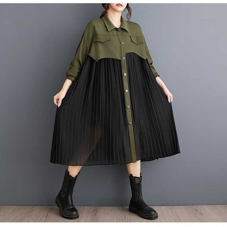 このワンピースの魅力は、その大胆な切り替えデザインと、異素材の組み合わせにあります。一枚で着るだけで、周りと差がつく個性的なスタイルが完成します。