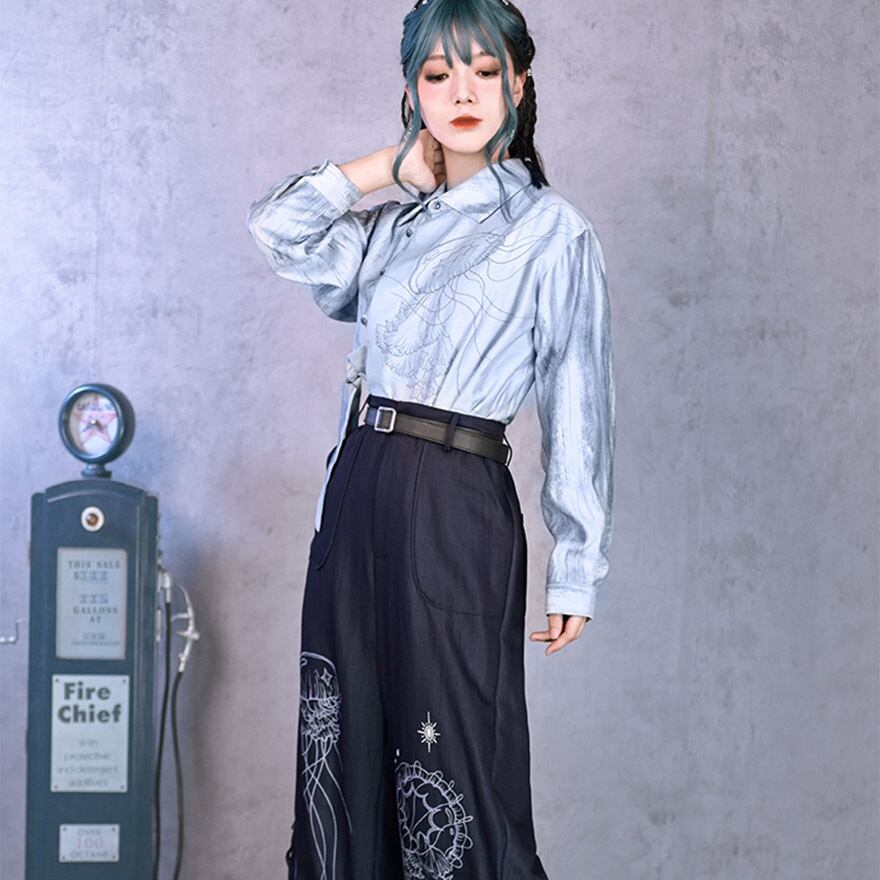 繊細なラインで描かれたクラゲのプリントが、アーティスティックな雰囲気を醸し出すデザインシャツです。