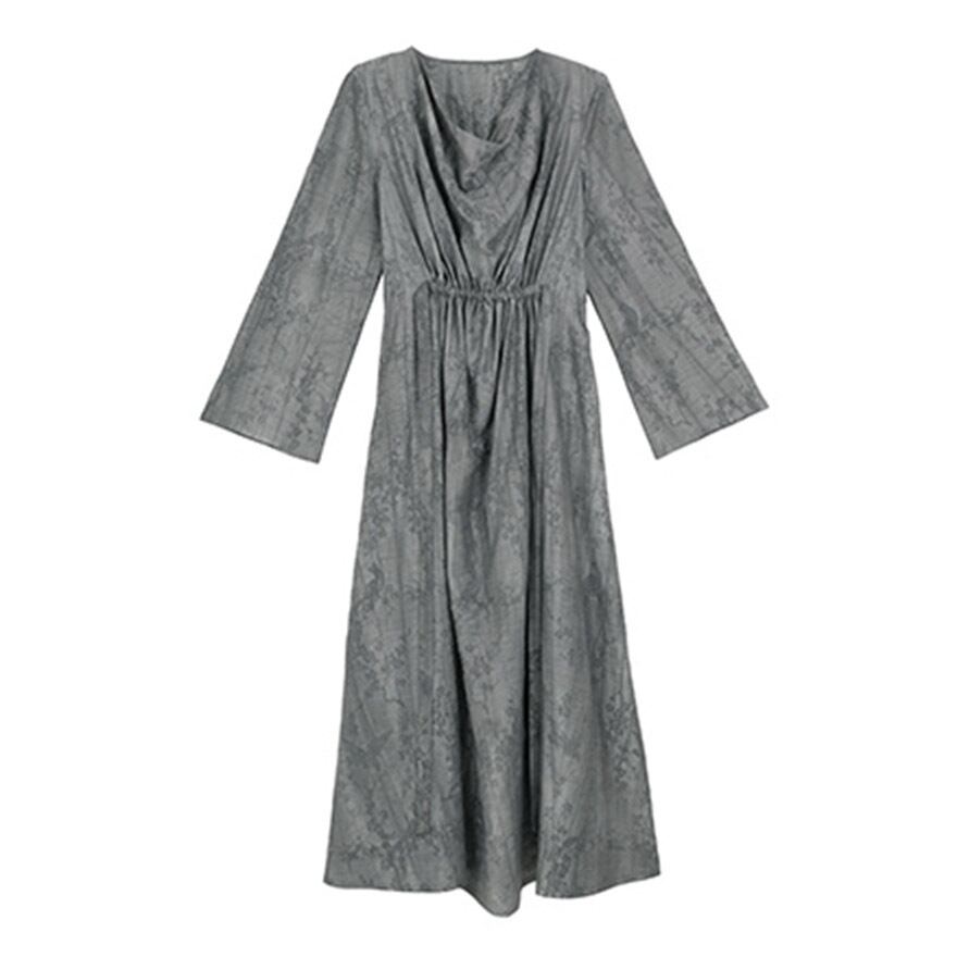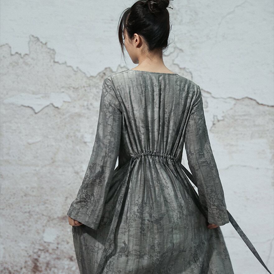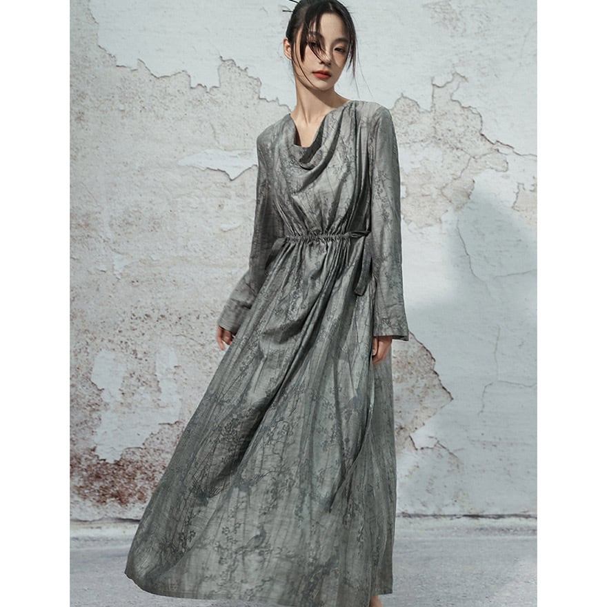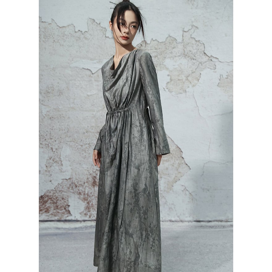 水墨画で描かれた花鳥画のように、繊細な模様が浮かび上がる、芸術的な生地を贅沢に使用したロングワンピースです。