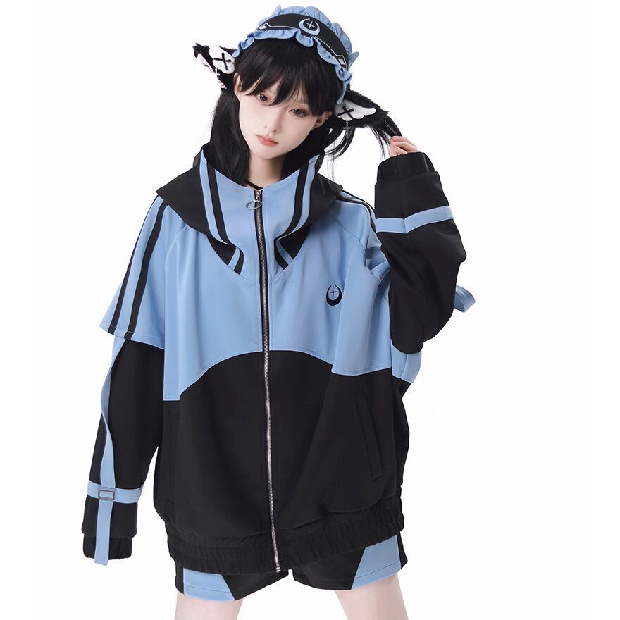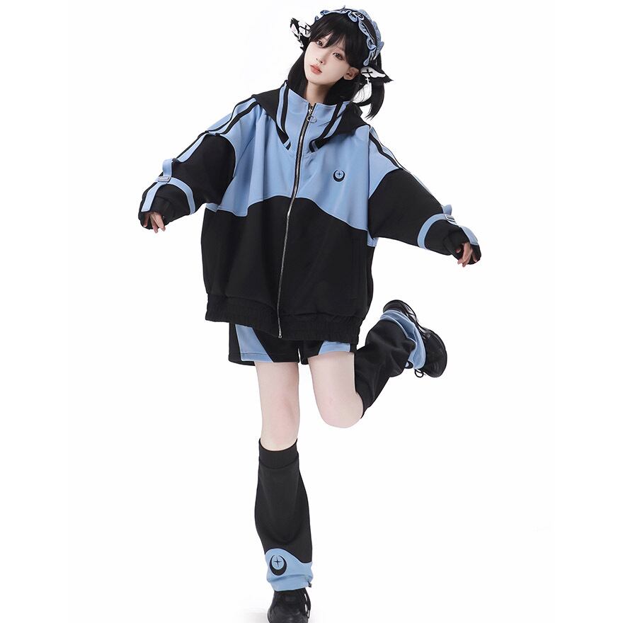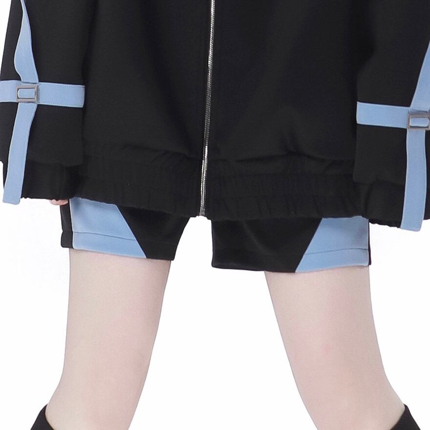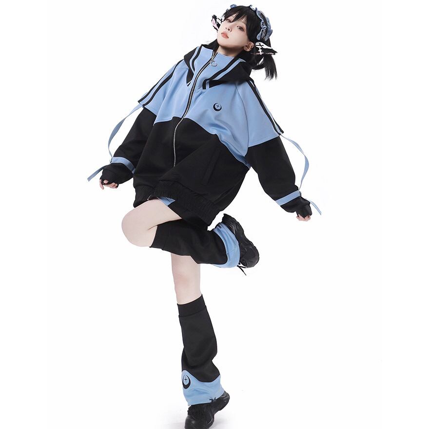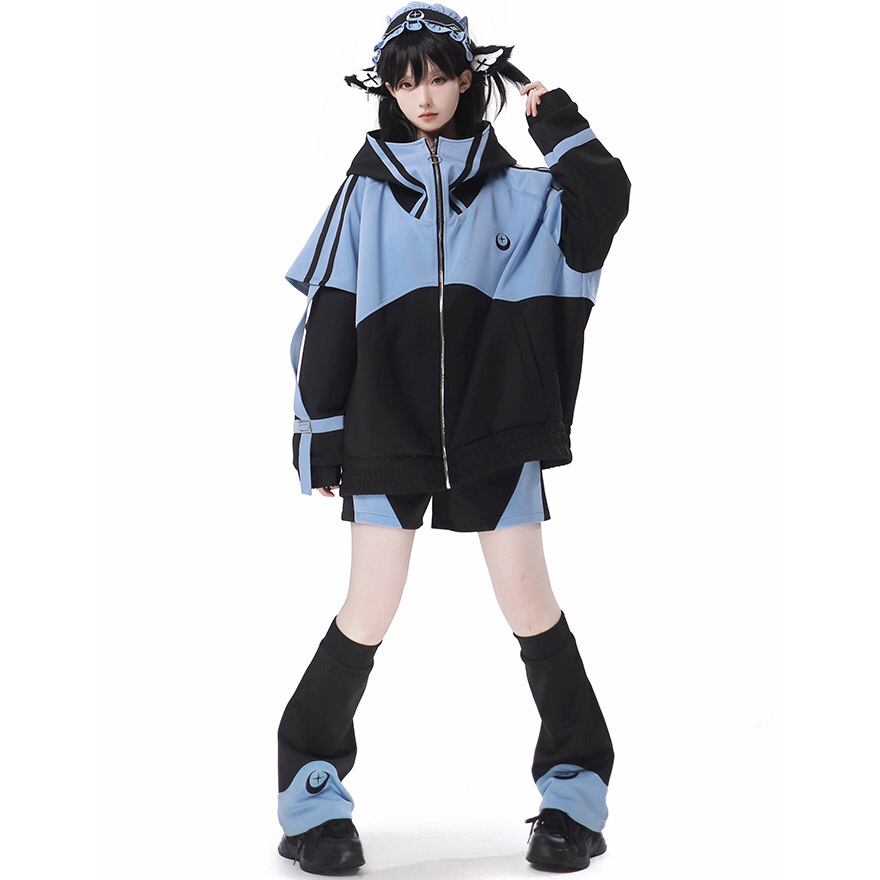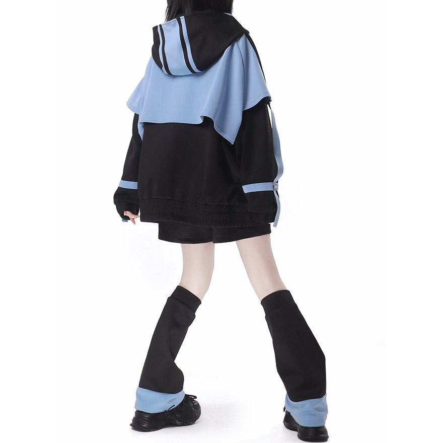 鮮やかなアクアブルーとブラックのコントラストが目を引く、アウター、ショートパンツ、レッグカバー、ヘッドドレスの豪華4点セットです。