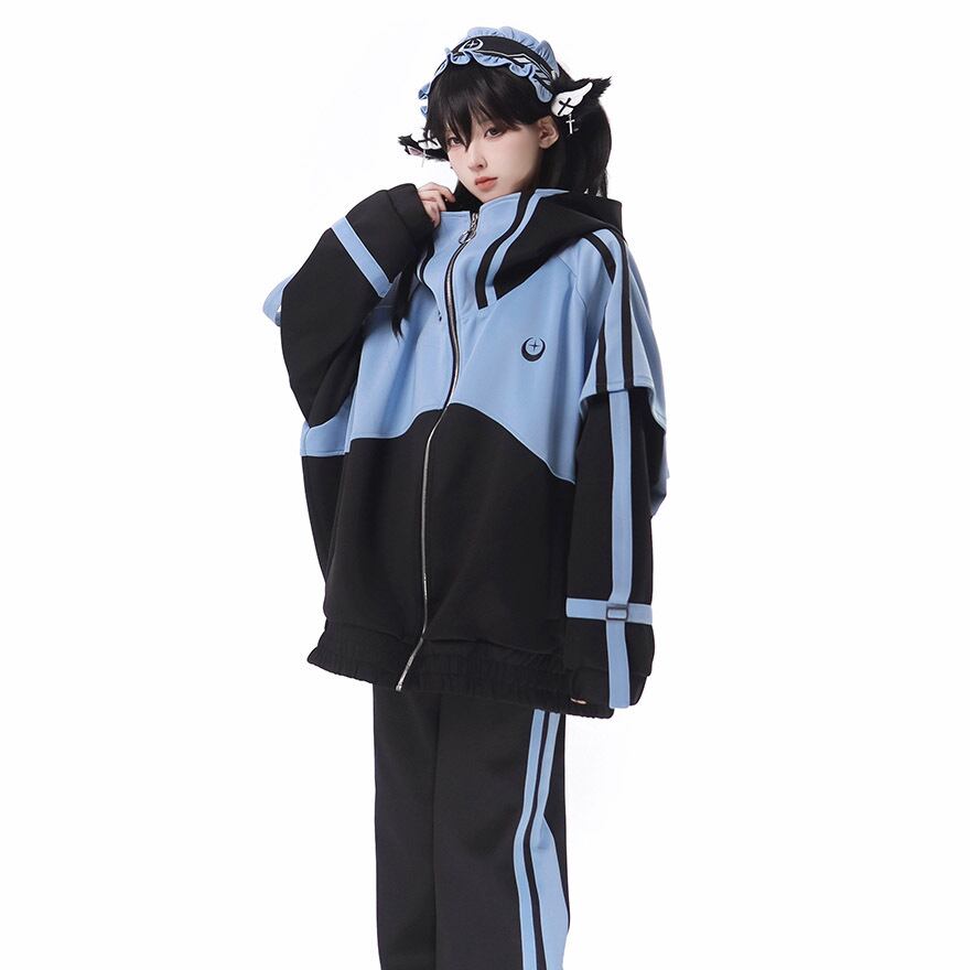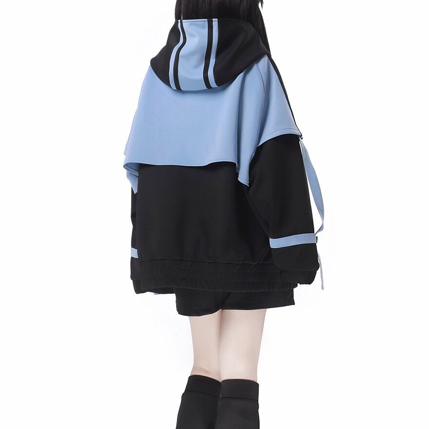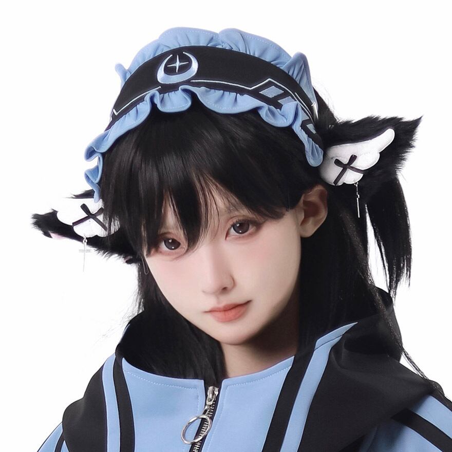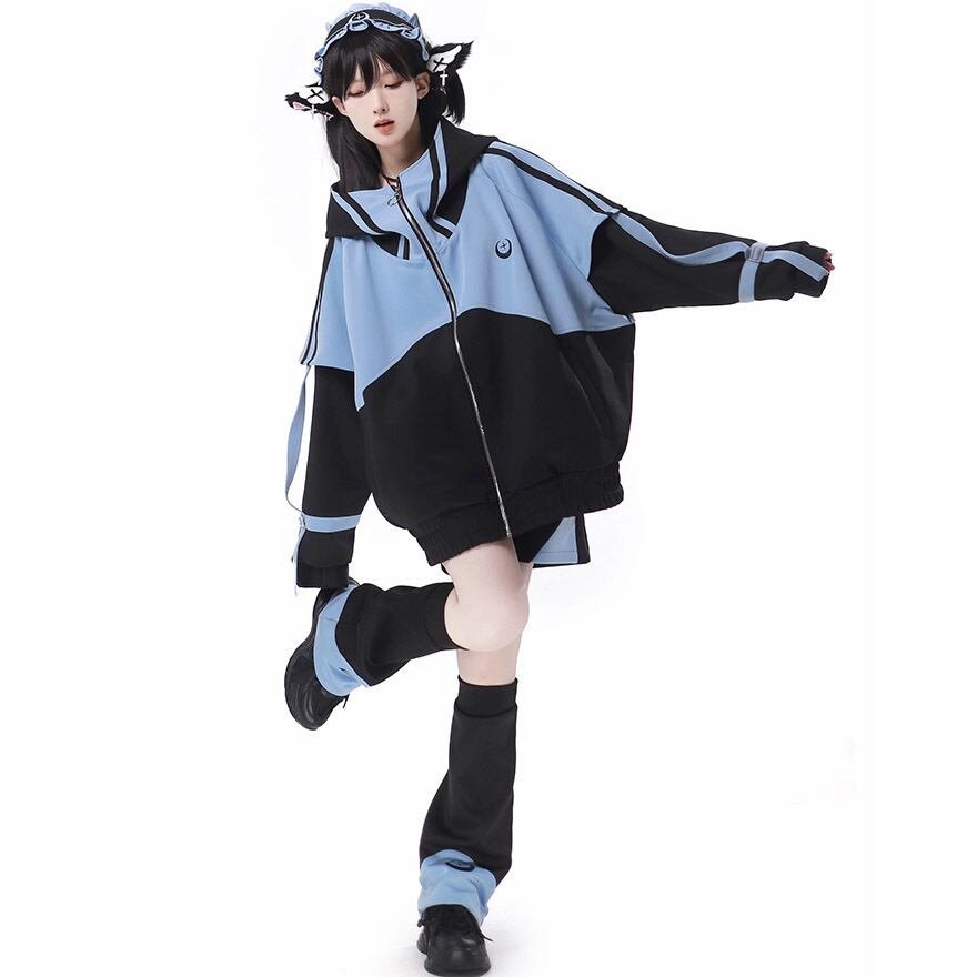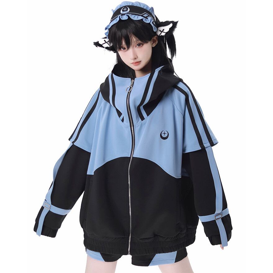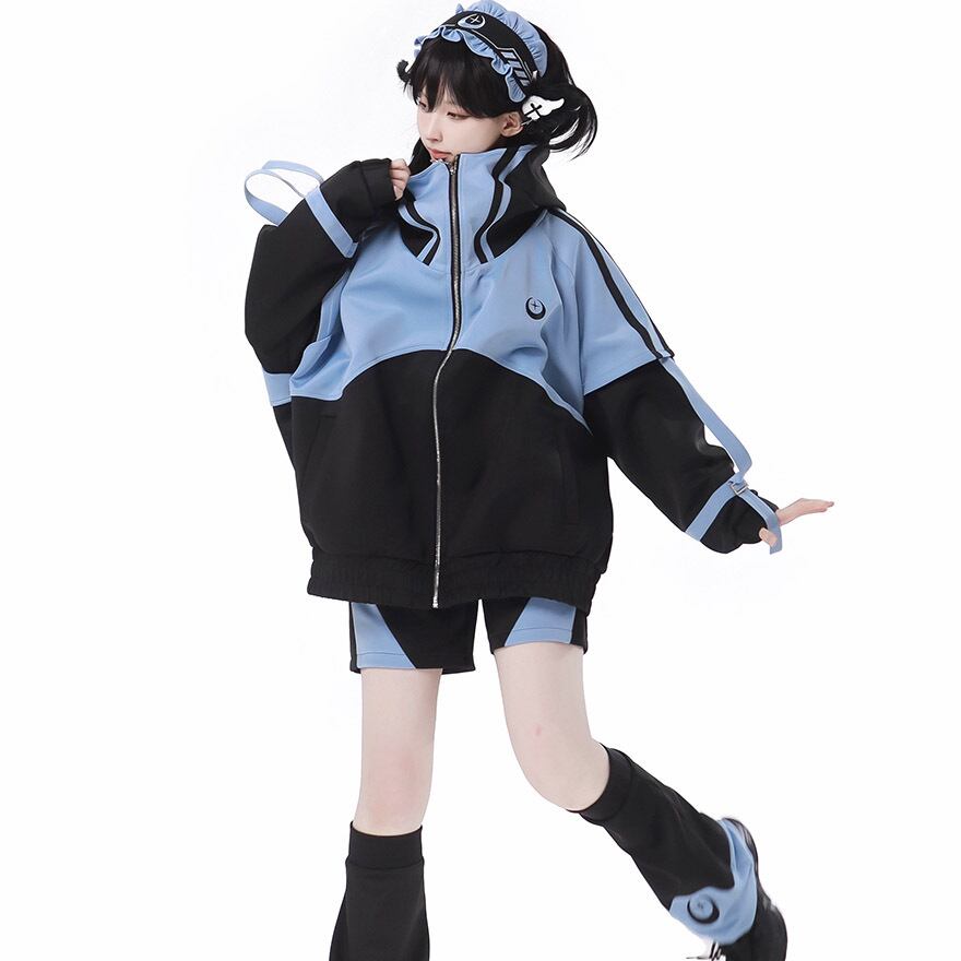 鮮やかなアクアブルーとブラックのコントラストが目を引く、アウター、ショートパンツ、レッグカバー、ヘッドドレスの豪華4点セットです。