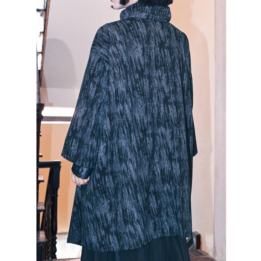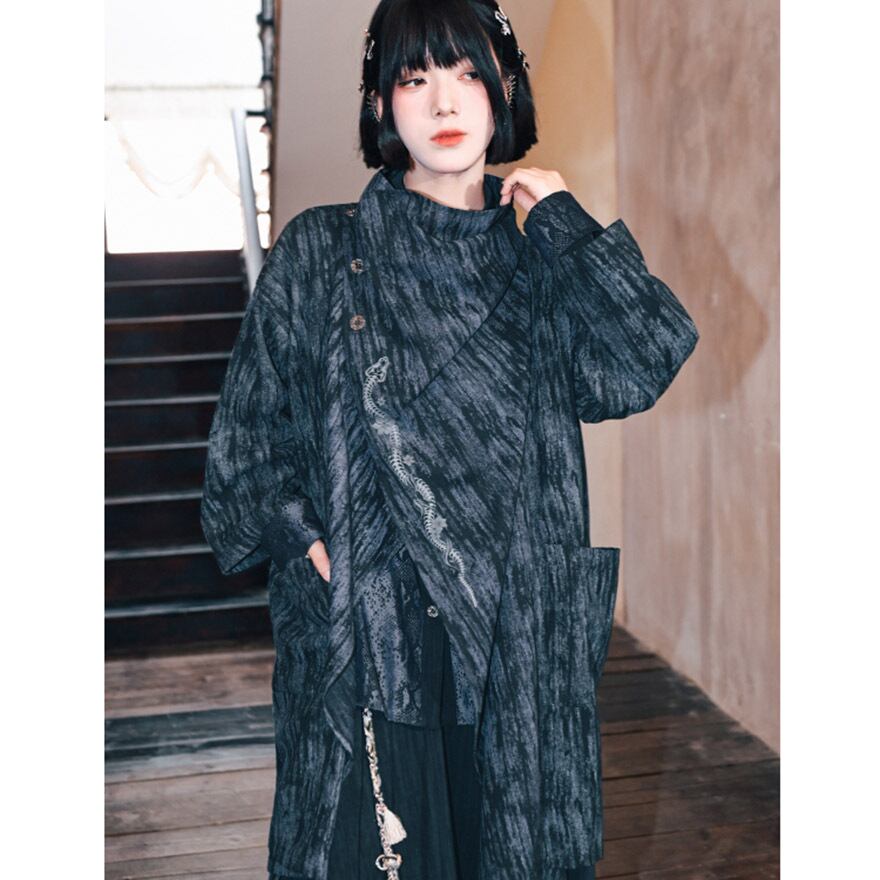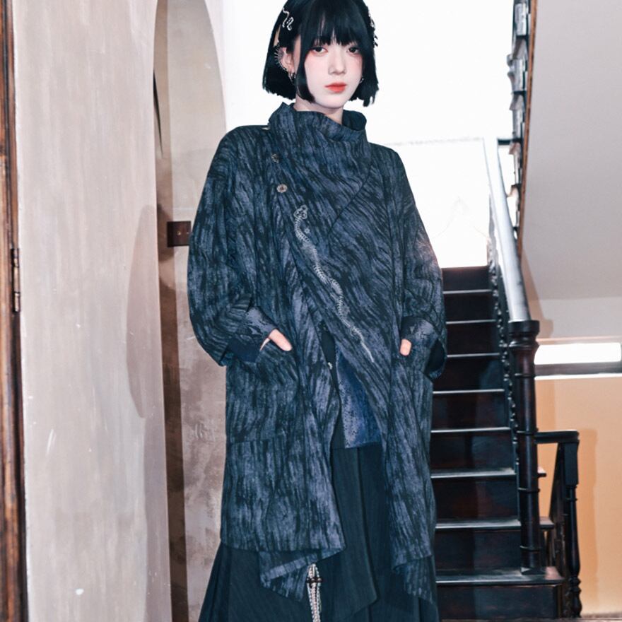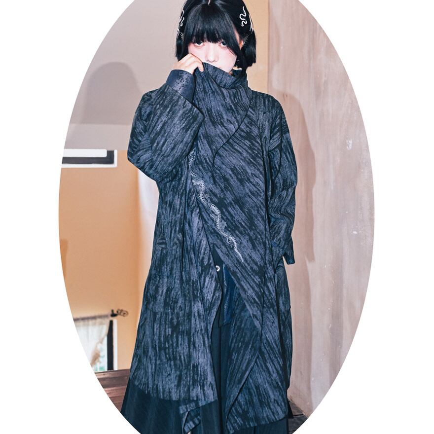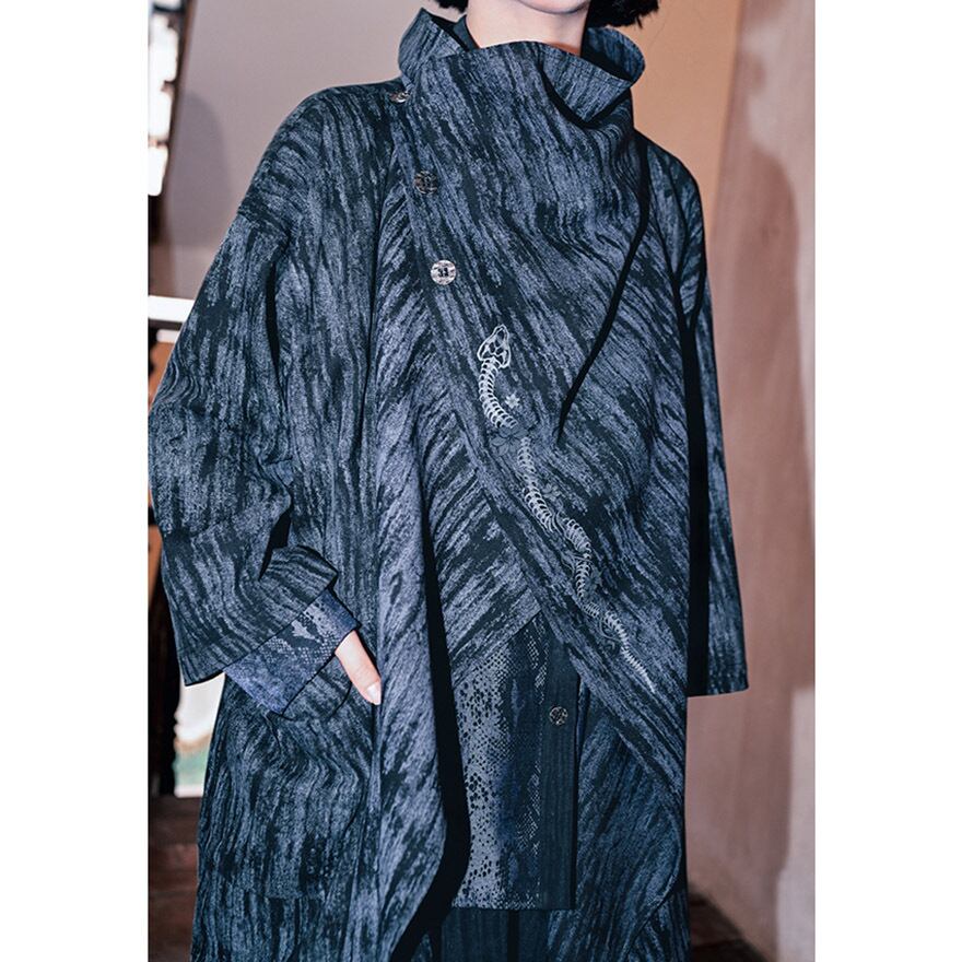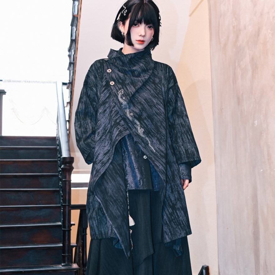 首元を覆うスタンドカラーと、斜めに配置されたアンティーク調のチャイナボタンが、独創的で洗練された印象を与えます。