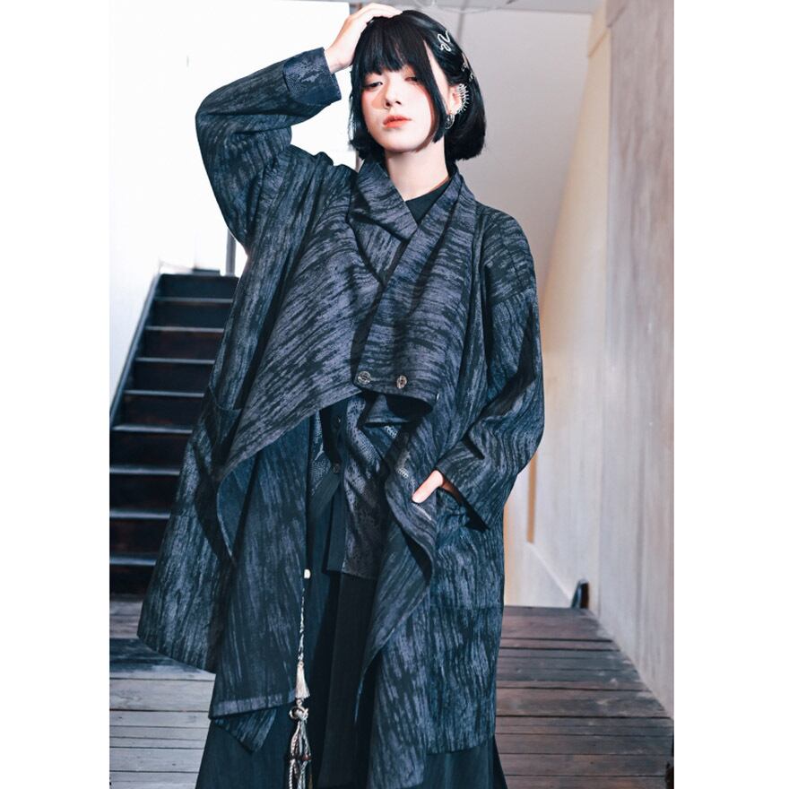 まるで水墨画のような、かすれた濃淡のある生地がアーティスティックな雰囲気を醸し出す、アシンメトリーデザインのジャケットです。