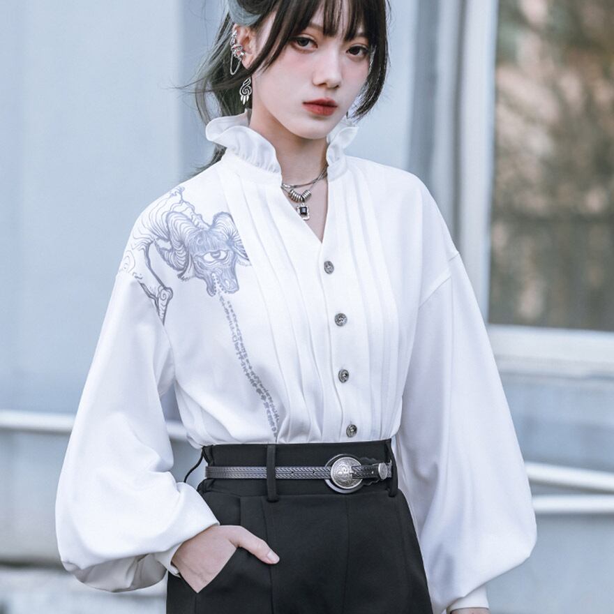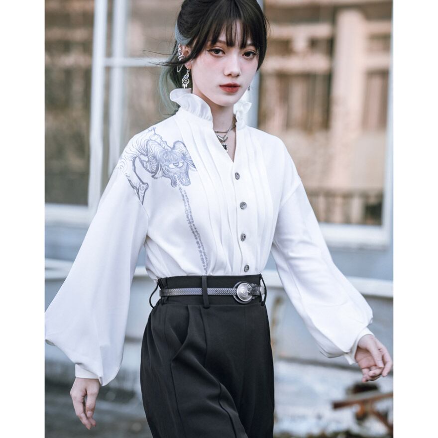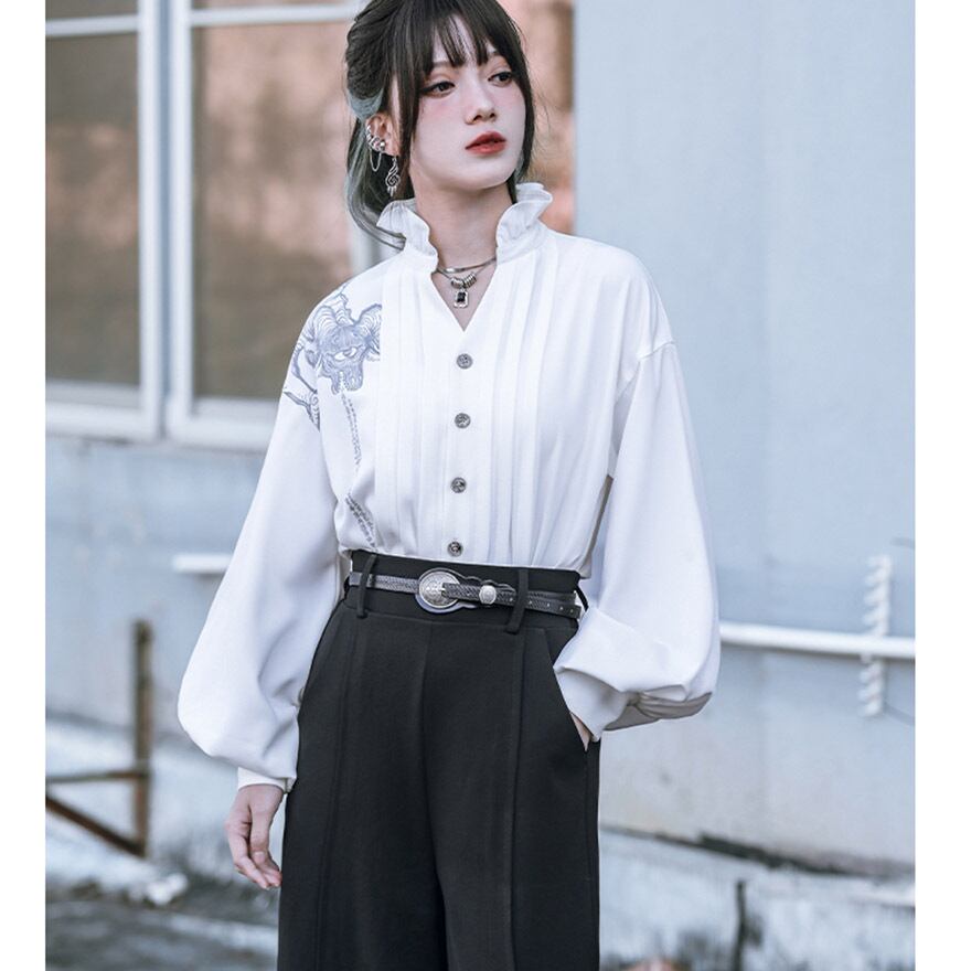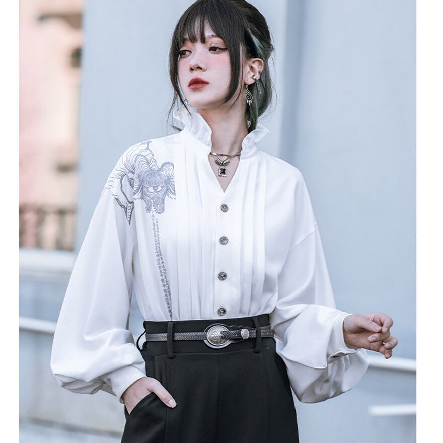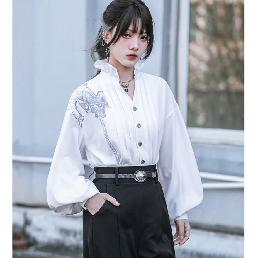 関連キーワード: #中華風 #ブラウス #デザインブラウス #モード系 #ストリートファッション #サブカル #個性的 #アート #プリント #バルーンスリーブ #フリルネック #とろみブラウス #大人かわいい #きれいめ #アラサーファッション