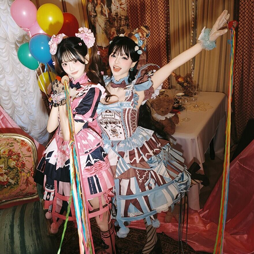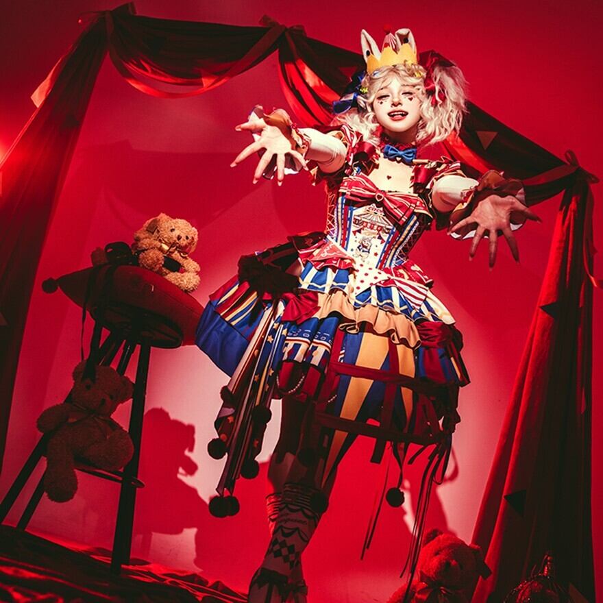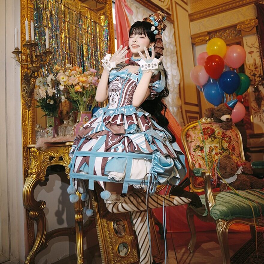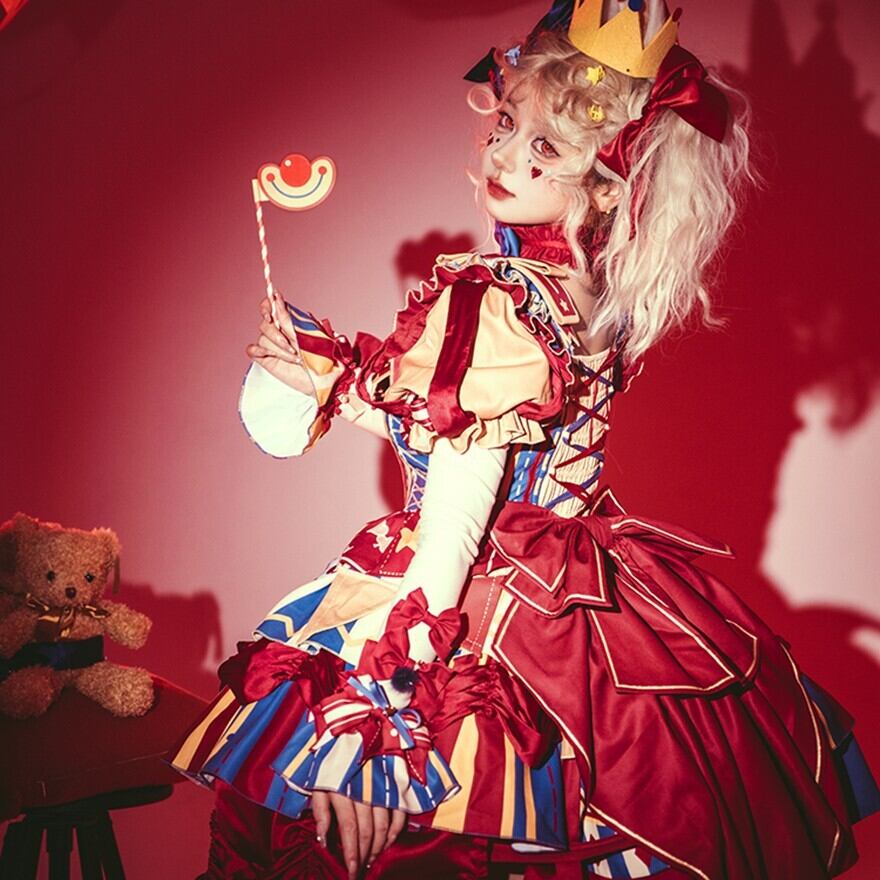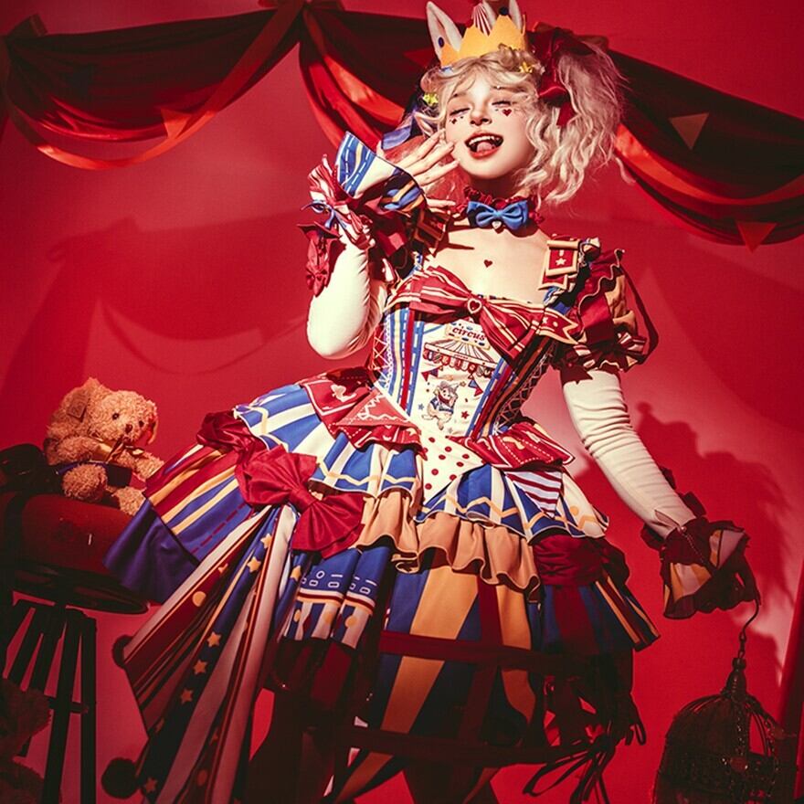 ふわっと広がるスカートには、大きなリボンやフリル、ポンポンがあしらわれ、まるでサーカスのテントやピエロの衣装のよう。コルセット風のデザインやアシンメトリーなスカート丈も特徴的で、どこから見ても華やかで楽しい気分になれる一着です。