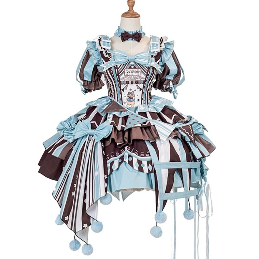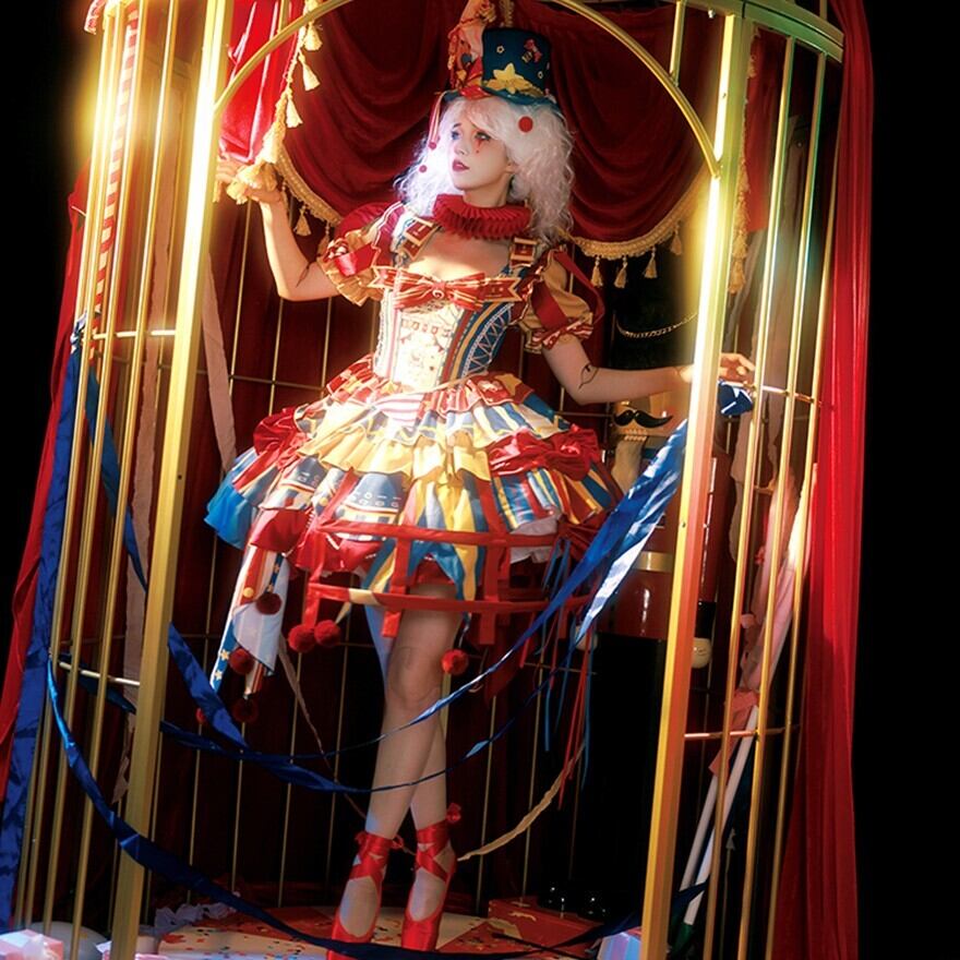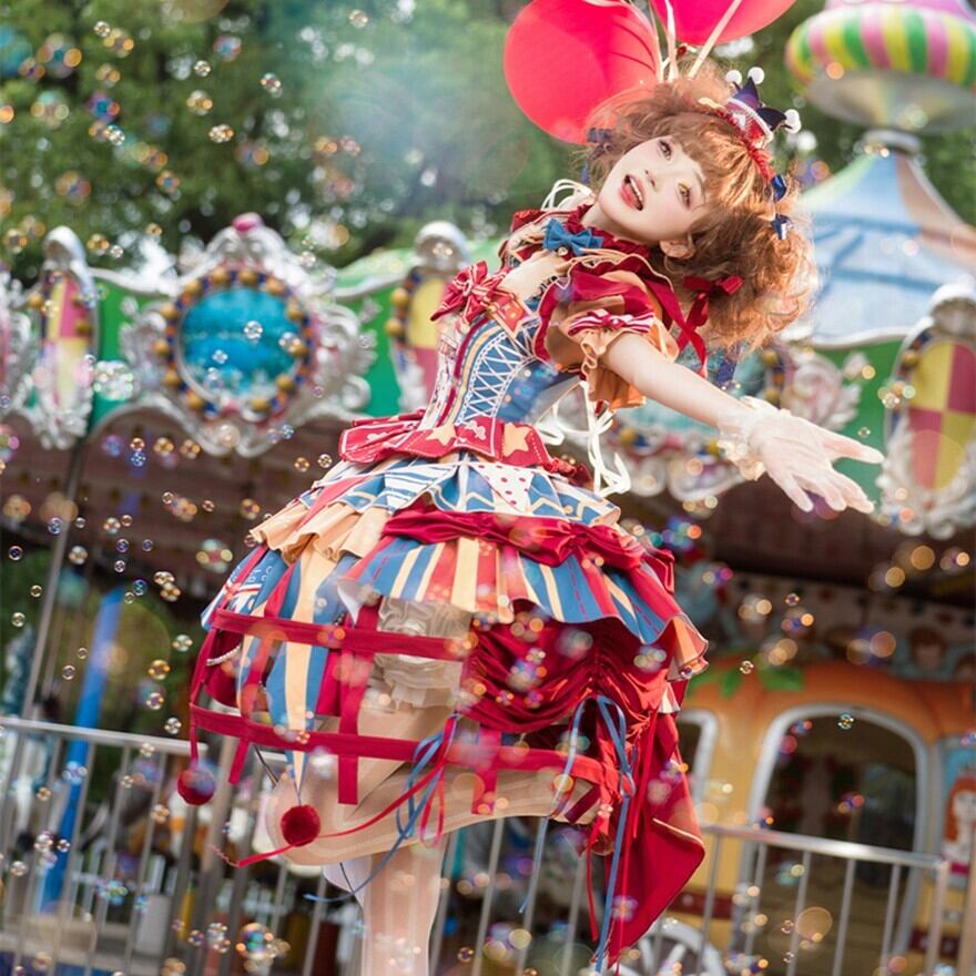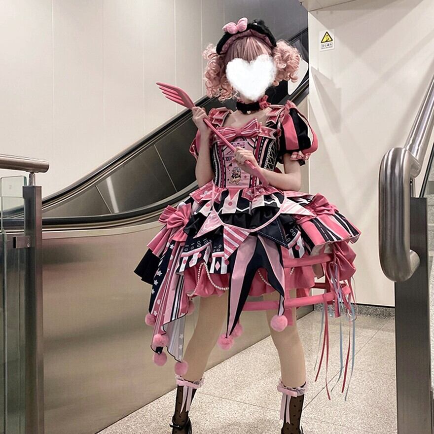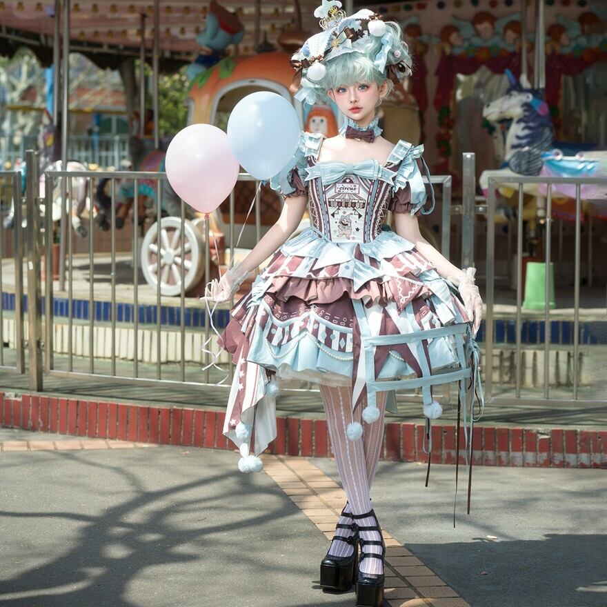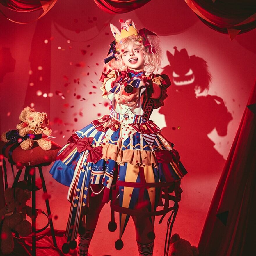 ふわっと広がるスカートには、大きなリボンやフリル、ポンポンがあしらわれ、まるでサーカスのテントやピエロの衣装のよう。コルセット風のデザインやアシンメトリーなスカート丈も特徴的で、どこから見ても華やかで楽しい気分になれる一着です。