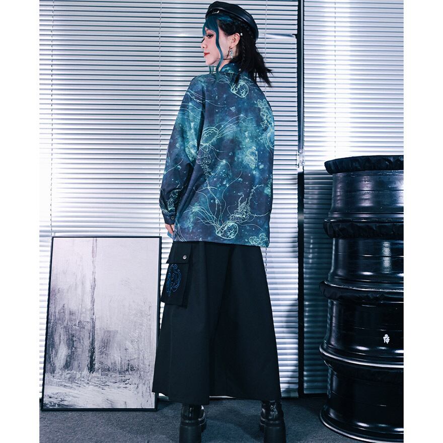 サイドには大きなカーゴポケットが配置され、片方には鮮やかなブルーで幻想的なクラゲのようなモチーフが刺繍されており、アシンメトリーなアクセントになっています。
