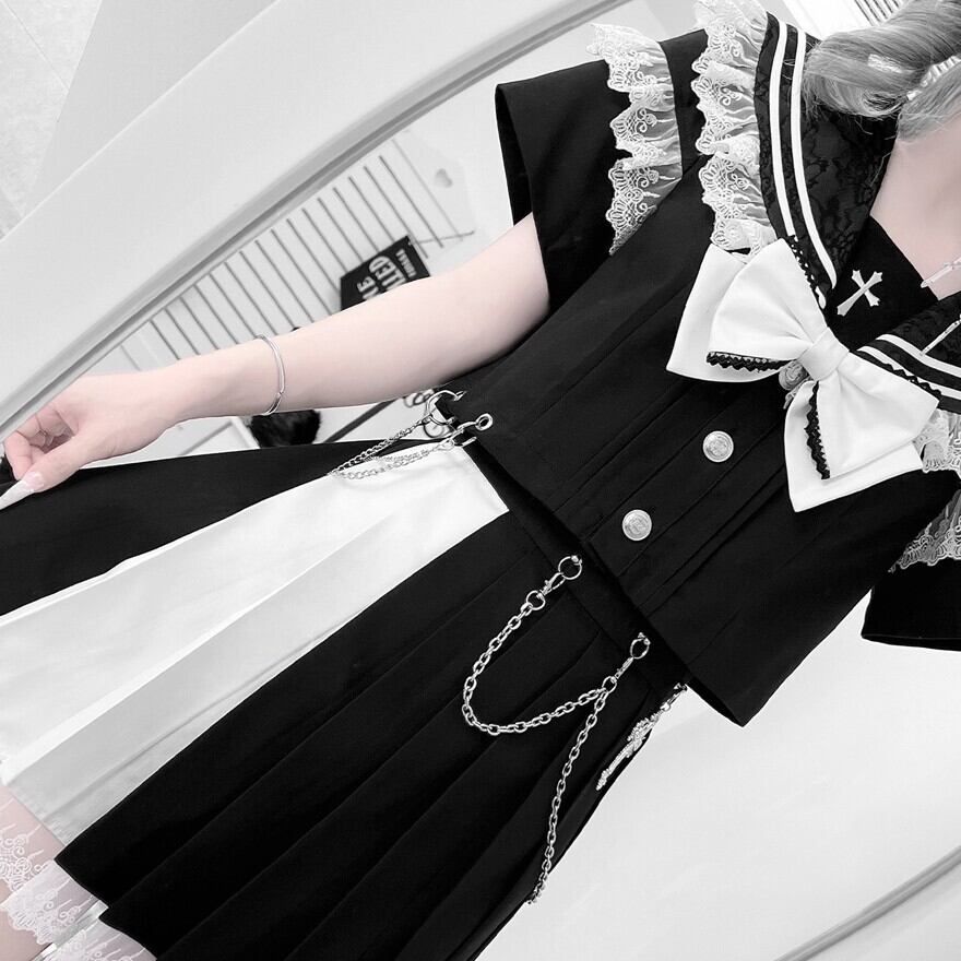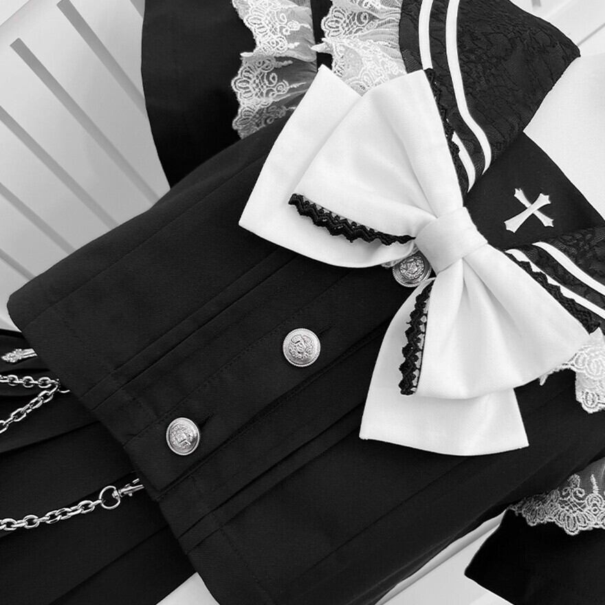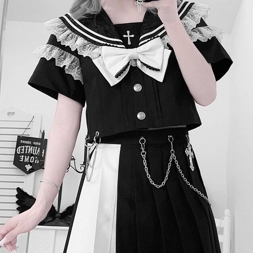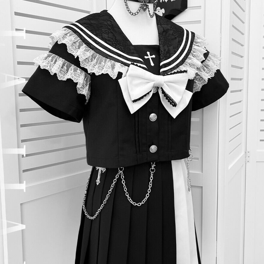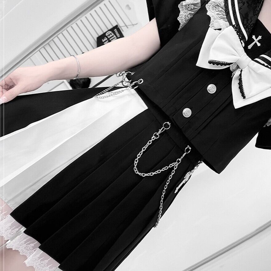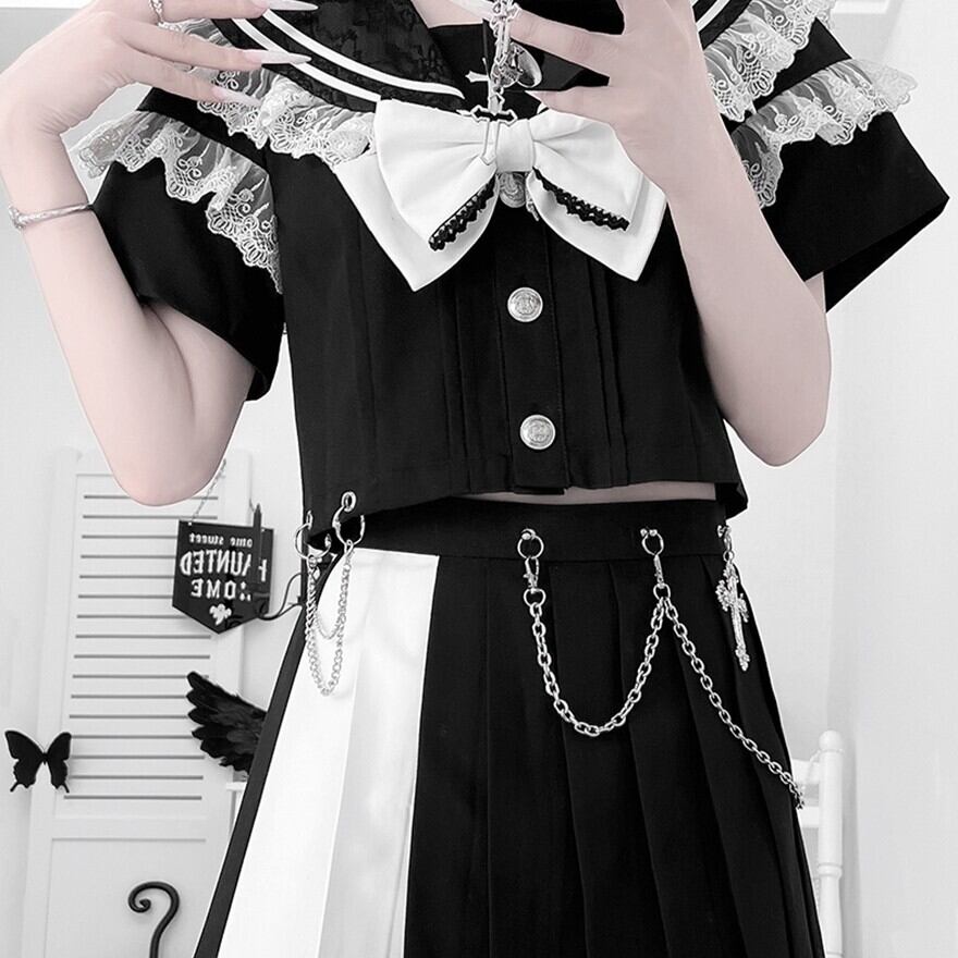 ブラックのセーラー風トップスとプリーツスカートに、ホワイトの大きなリボンとスカートチェーンが特徴的なセットアップです。
