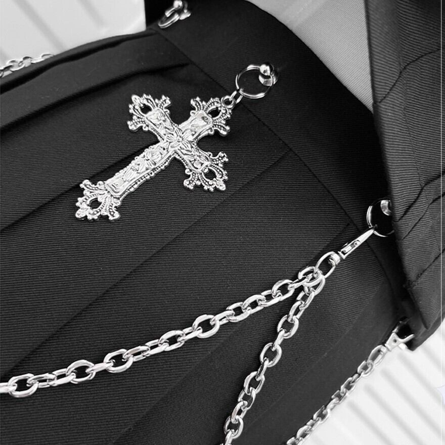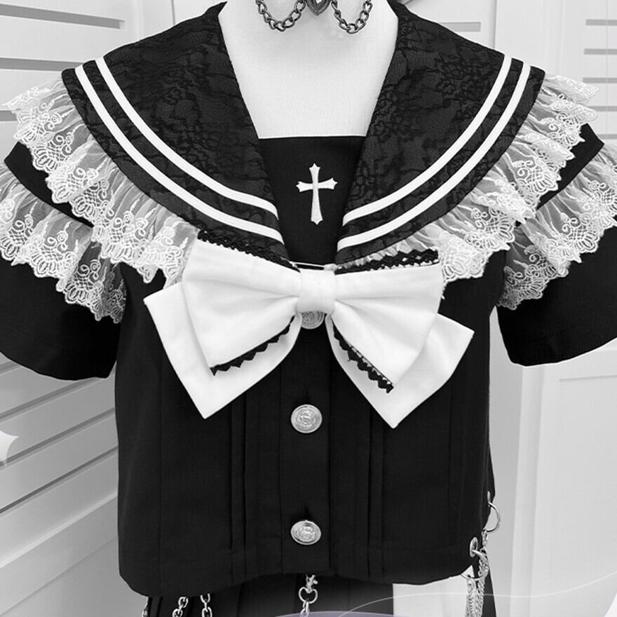 襟と袖には繊細なレースがあしらわれ、十字架のチャームがゴシックな雰囲気をプラスしています。