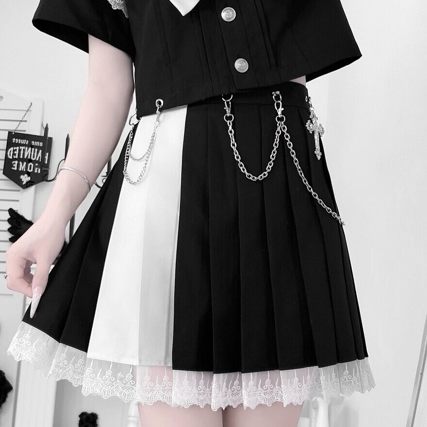 スカートはブラックとホワイトのバイカラーになっており、歩くたびに揺れるプリーツのシルエットが、個性的ながらも可愛らしい印象を与えます。