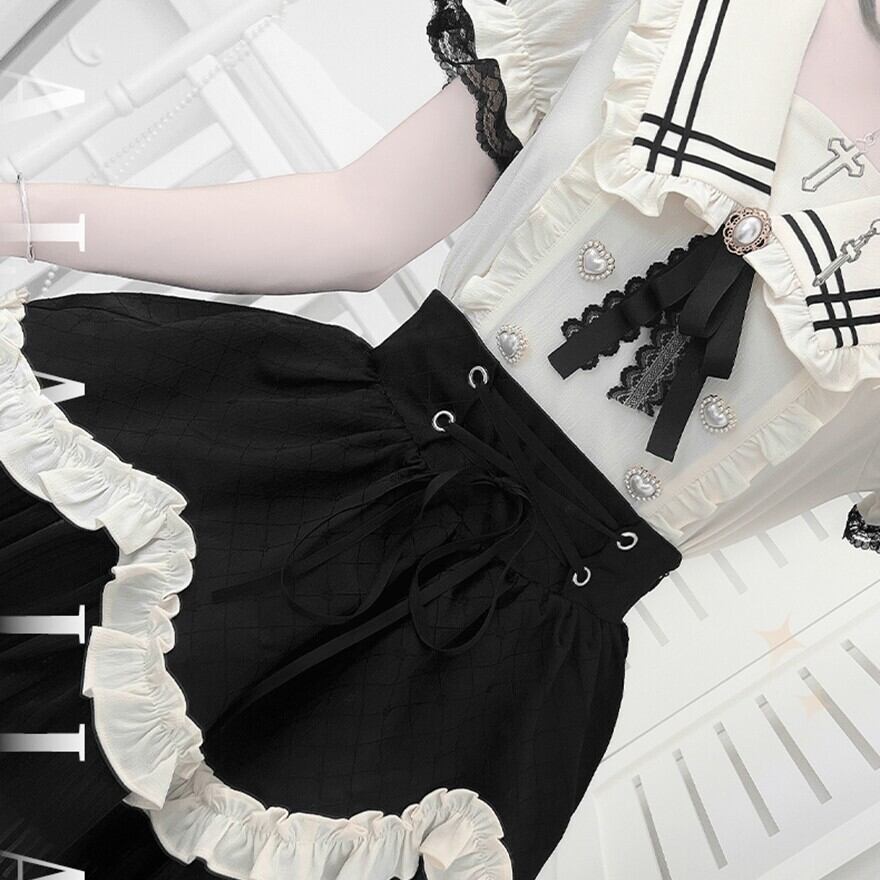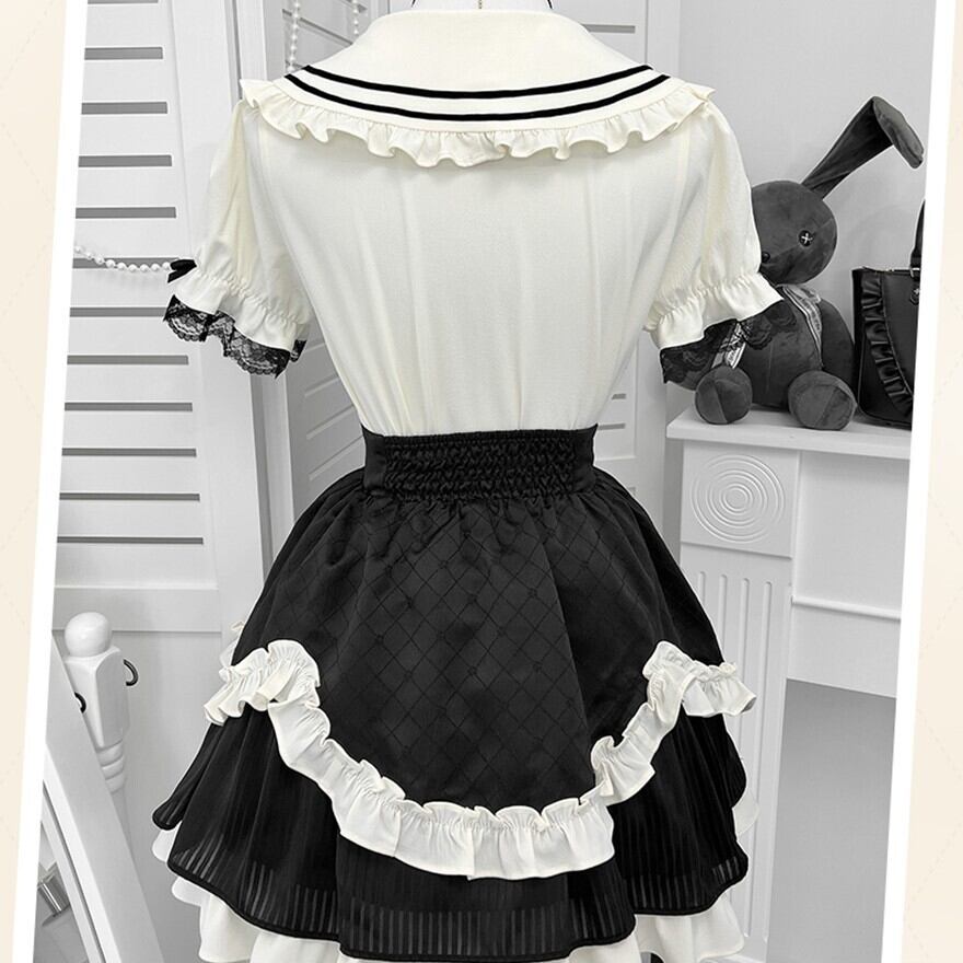 アイボリーのセーラー風トップスと、ブラックのレースアップスカートのセットアップです。