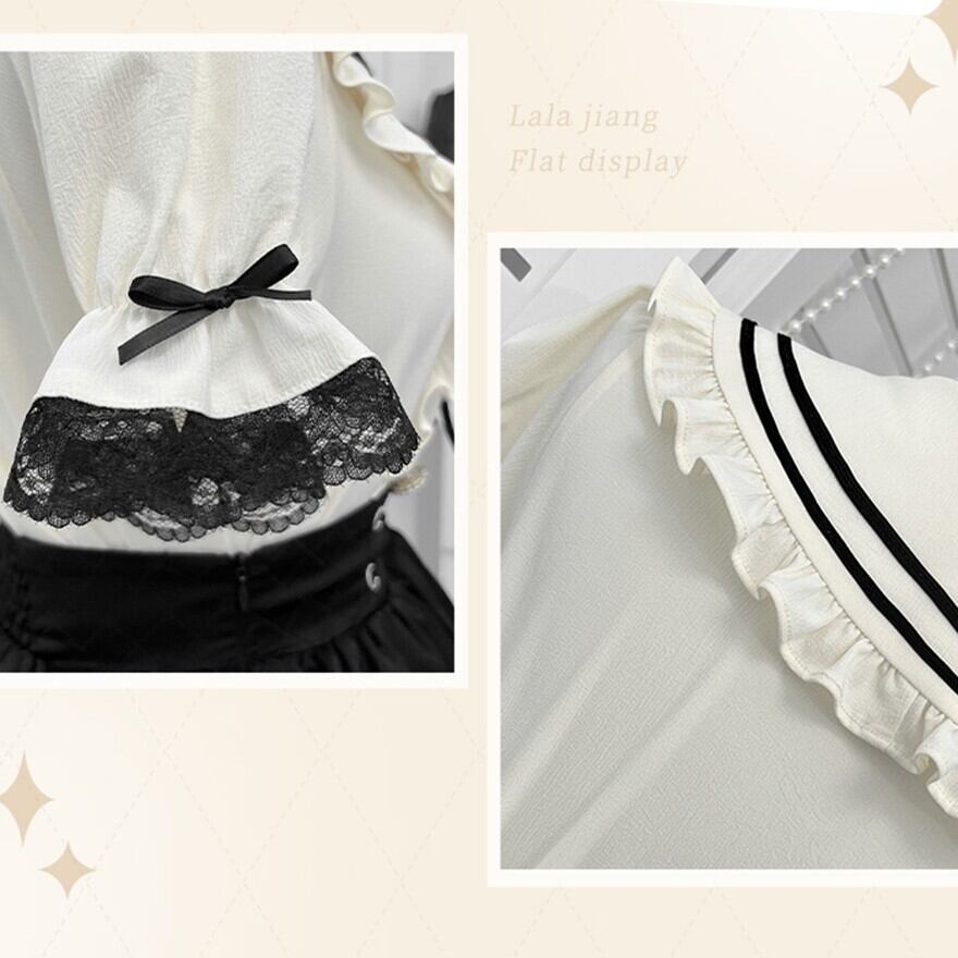 トップスは、セーラー襟とパフスリーブに施された繊細なレースが特徴で、胸元の大きなリボンが可愛らしいアクセントになっています。