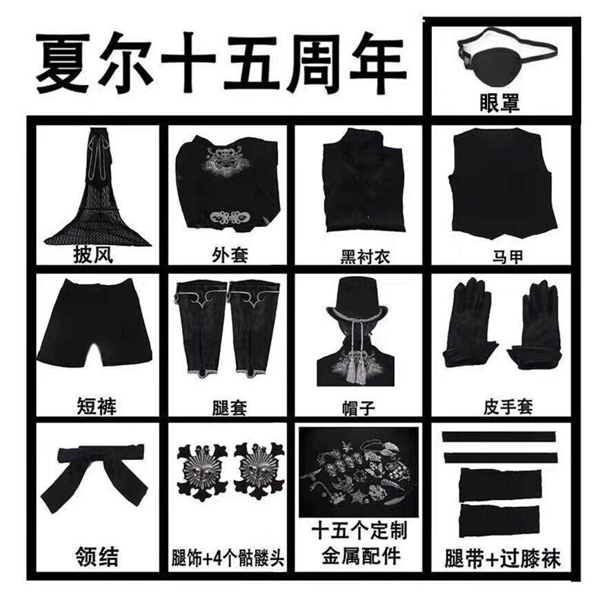 セットアップ :アイパッチ、ケープ 、 ジャケット、黒いシャツ、ベスト、ショートパンツ、レッグカバー、 帽子、レザーグローブ、 蝶ネクタイ、レッグベルト+ニーハイソックス、15個のカスタムメタルパーツ、レッグアクセサリー+スカルチャーム4個
