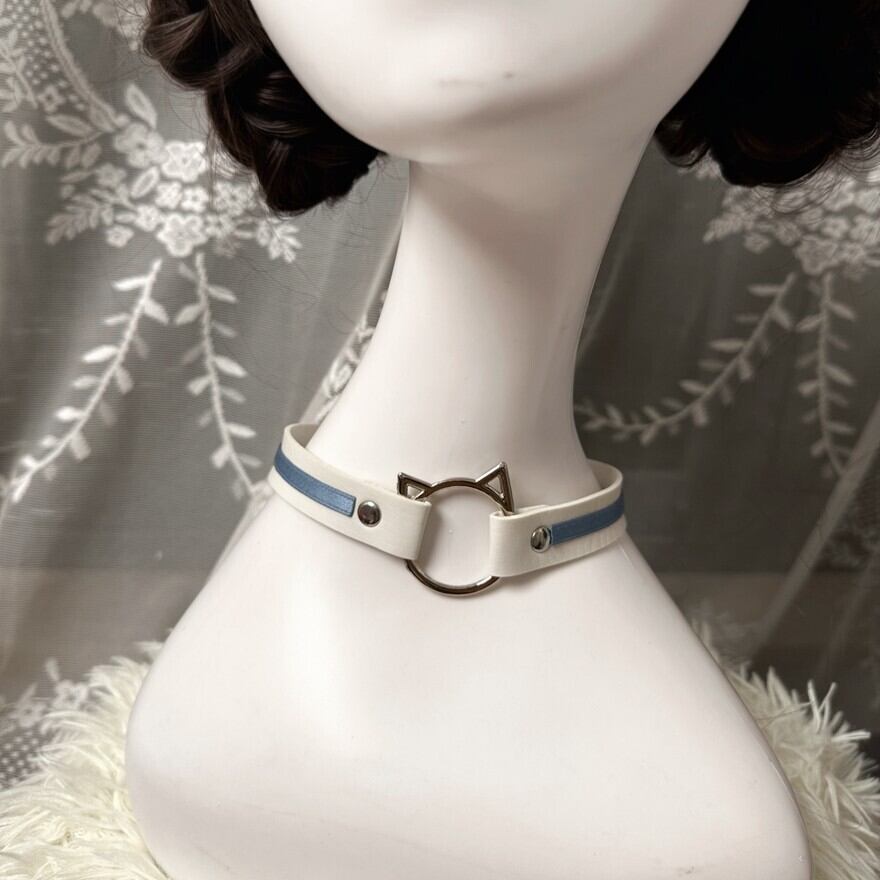 可愛らしい猫耳モチーフと、パンクな雰囲気のベルトがミックスされた、個性的なチョーカーです。