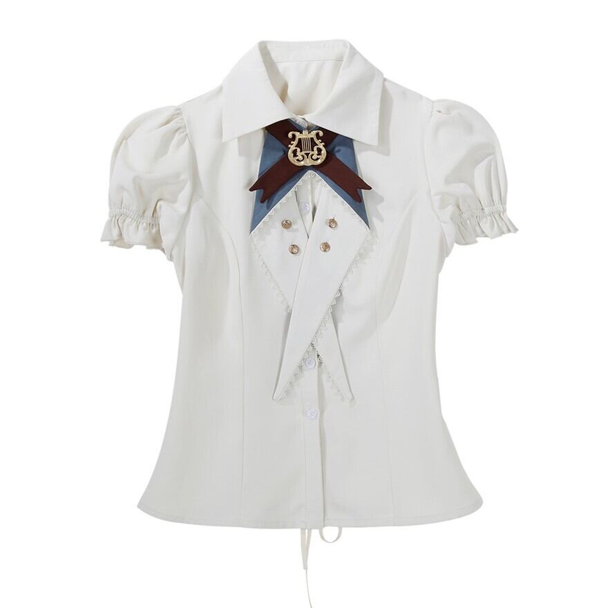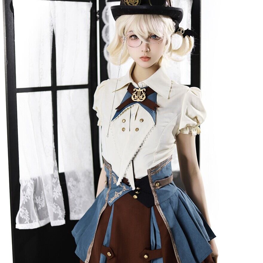アイボリーのパフスリーブブラウスと、ブラウン×くすんだブルーの配色が特徴的な、スチームパンク調のロリータセットアップです。