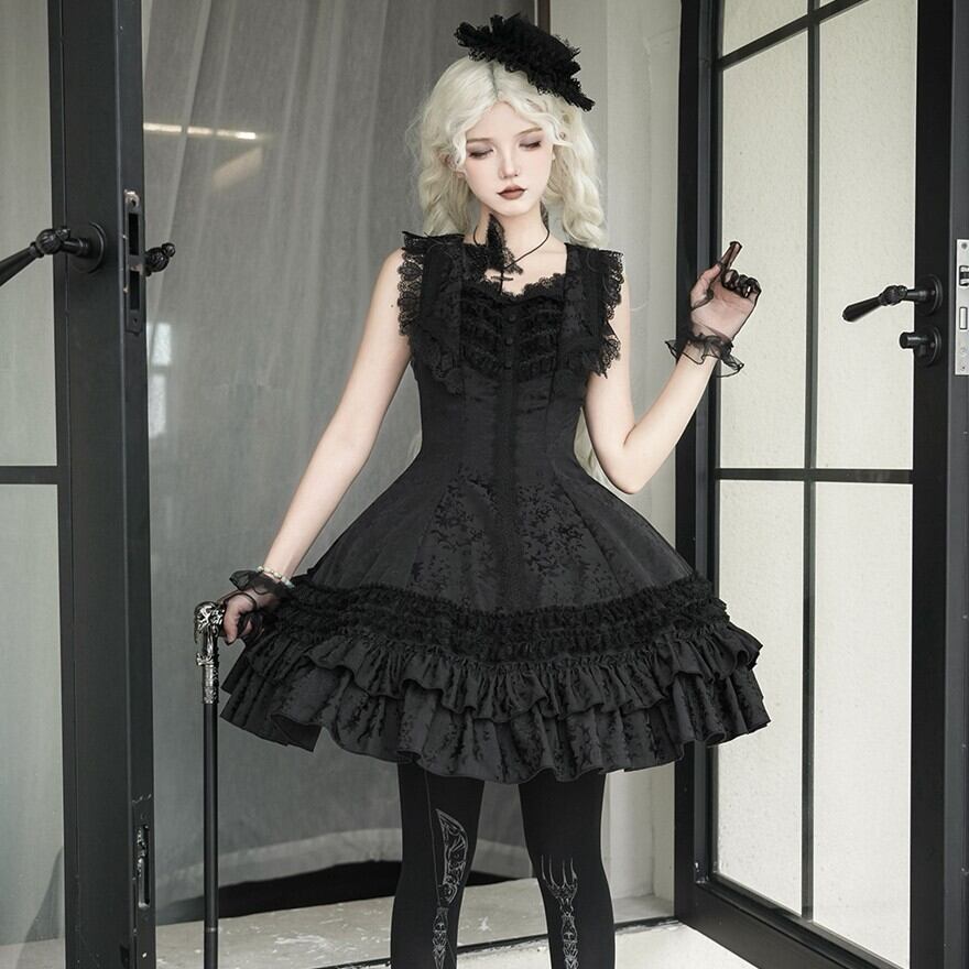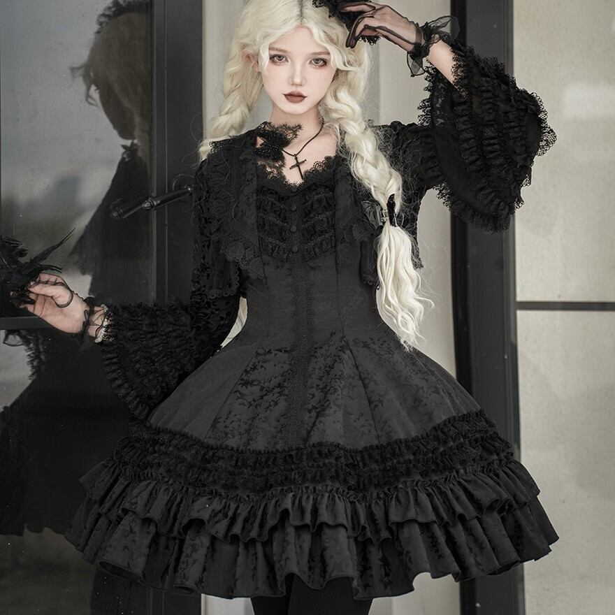 ゴスロリ ドレス ジャガード生地 フリル レース ダークファッション 大人ゴシック