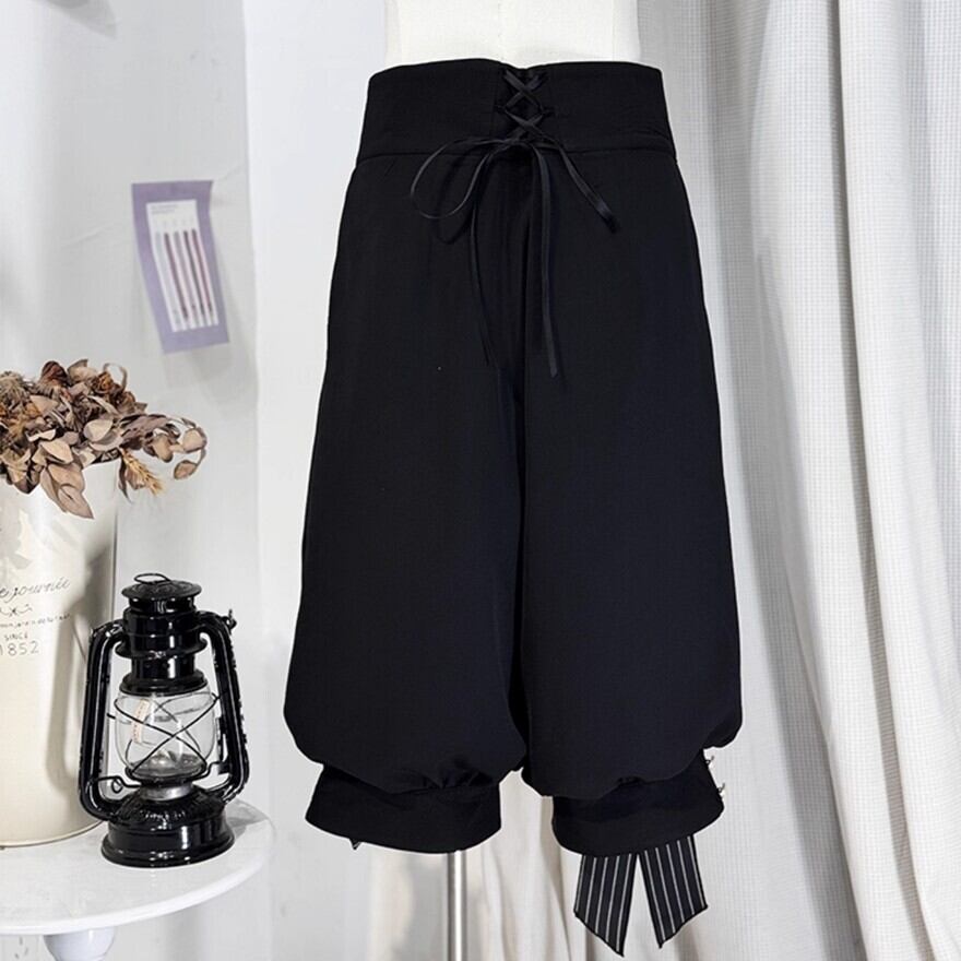 ブラックの生地に、オフホワイトの繊細なレースが襟元、袖、そしてズボンにあしらわれた、クラシカルロリータのセットアップです。