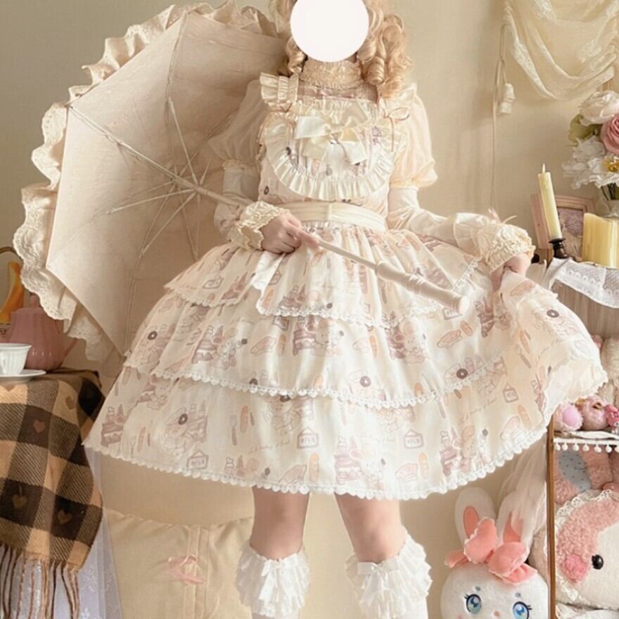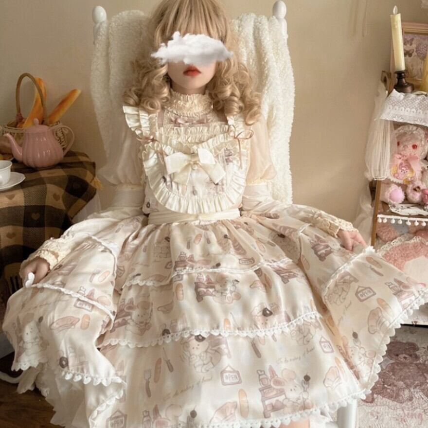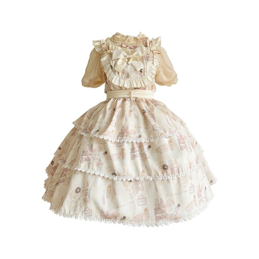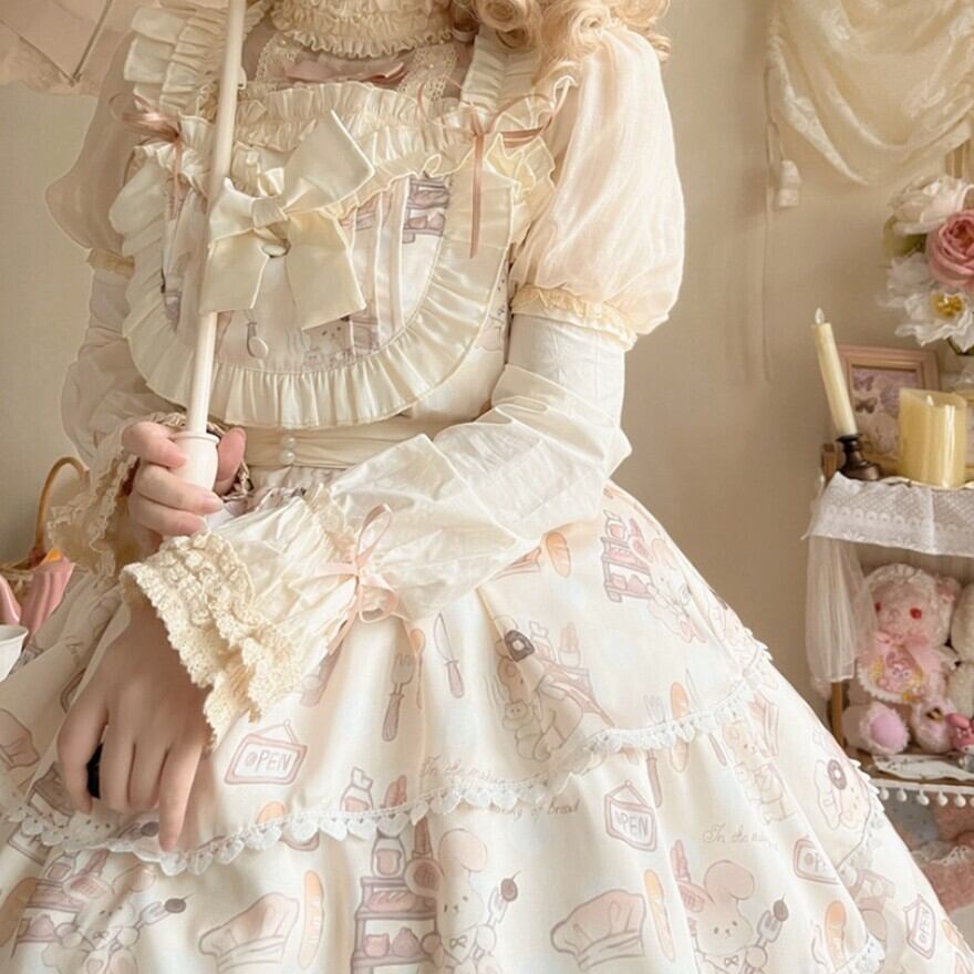 こちらはクリーム色の生地に、焼き立てのパンやコック帽をかぶったネズミのキャラクターが描かれた、可愛らしいロリータワンピースです。