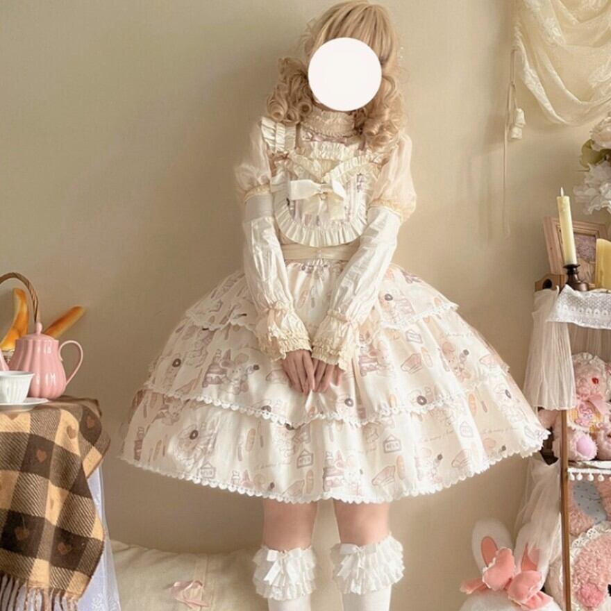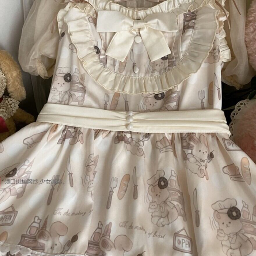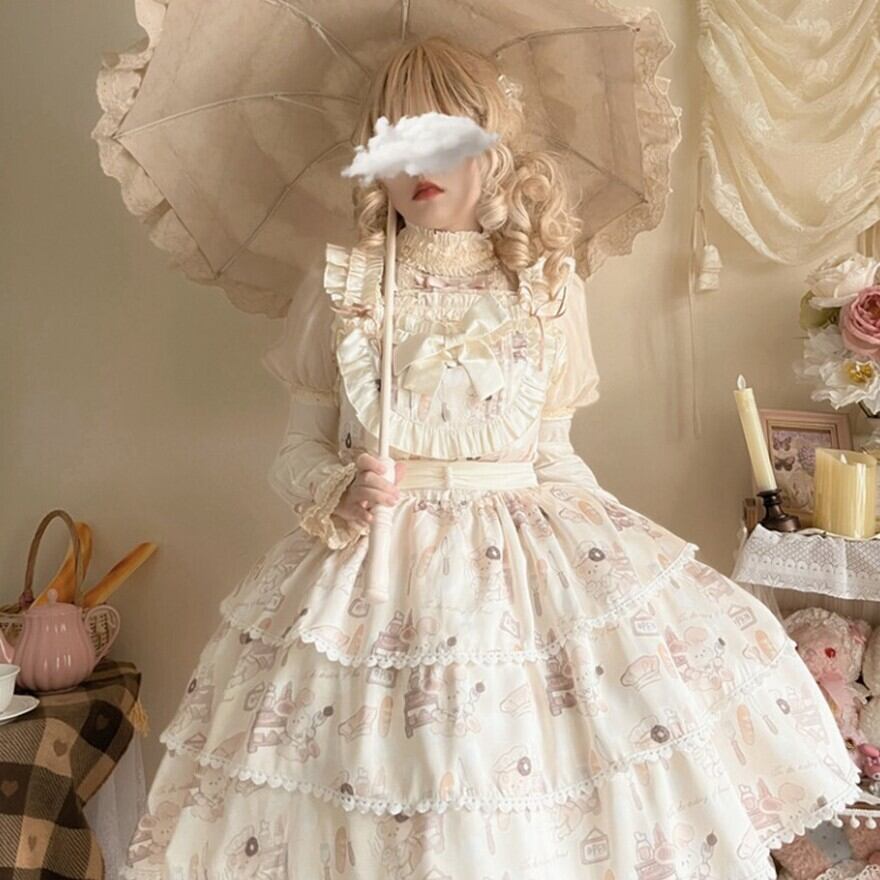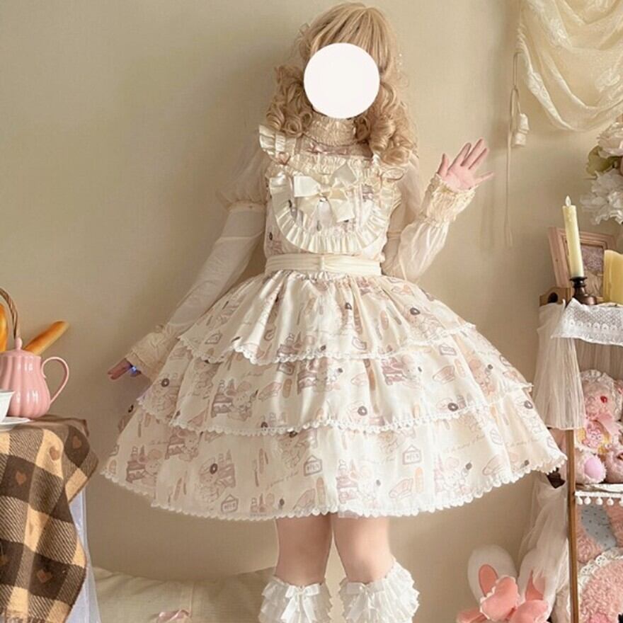 こちらはクリーム色の生地に、焼き立てのパンやコック帽をかぶったネズミのキャラクターが描かれた、可愛らしいロリータワンピースです。
