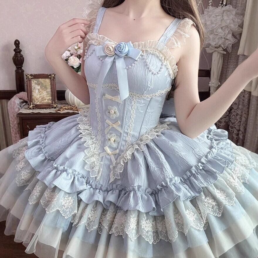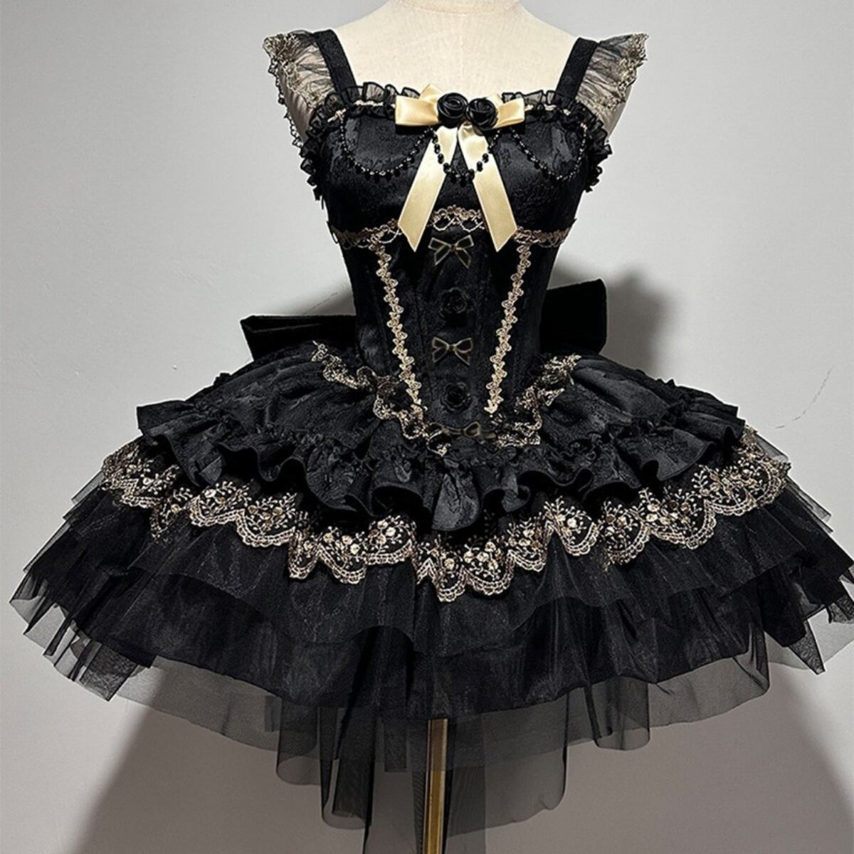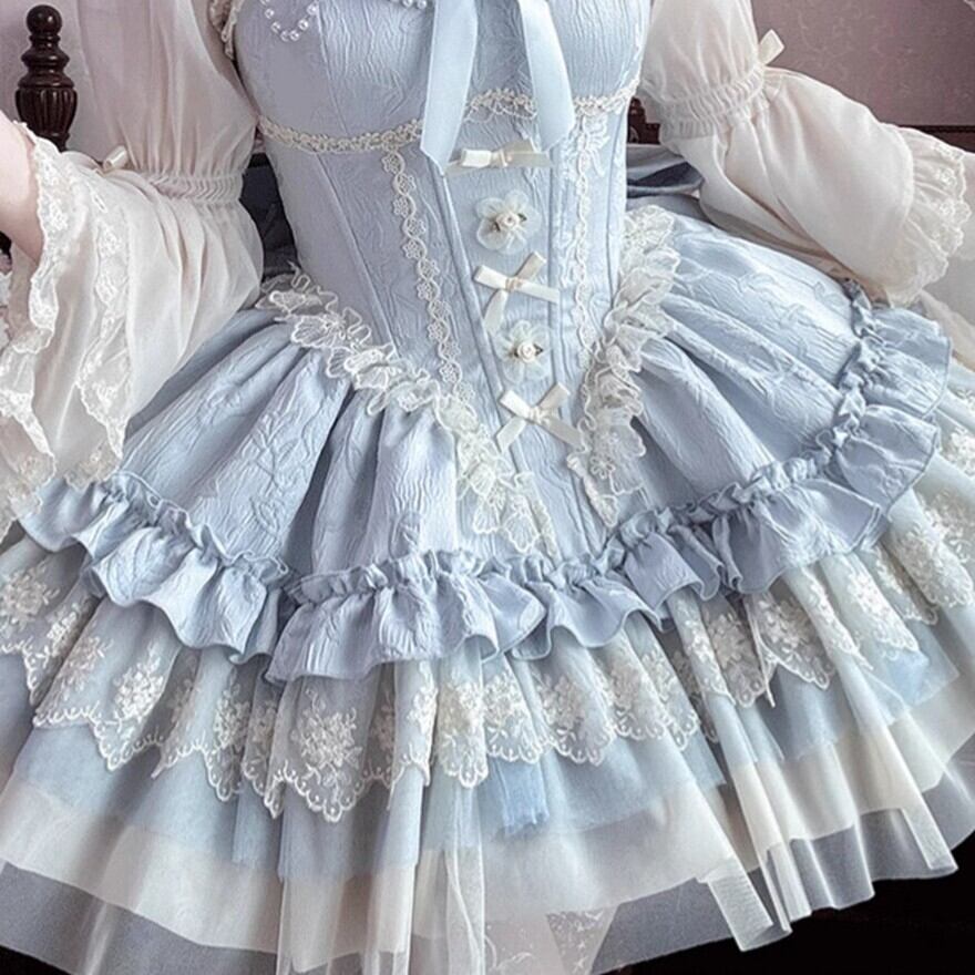 こちらはコルセット風の胸元と、幾重にも重なったフリルスカートが特徴的なロリータドレスです。
