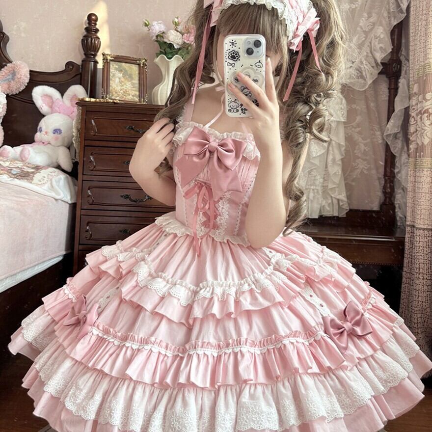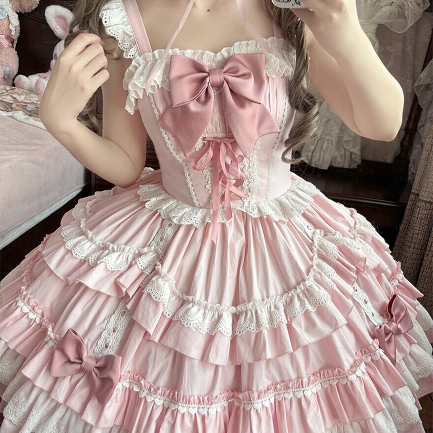 写真映えも抜群の、甘くて可愛らしいスタイルが魅力のジャンパースカート。まるで砂糖菓子やケーキのような、とことん甘いデザインが好きな方にぴったりです。