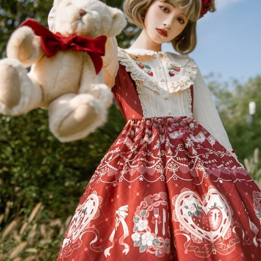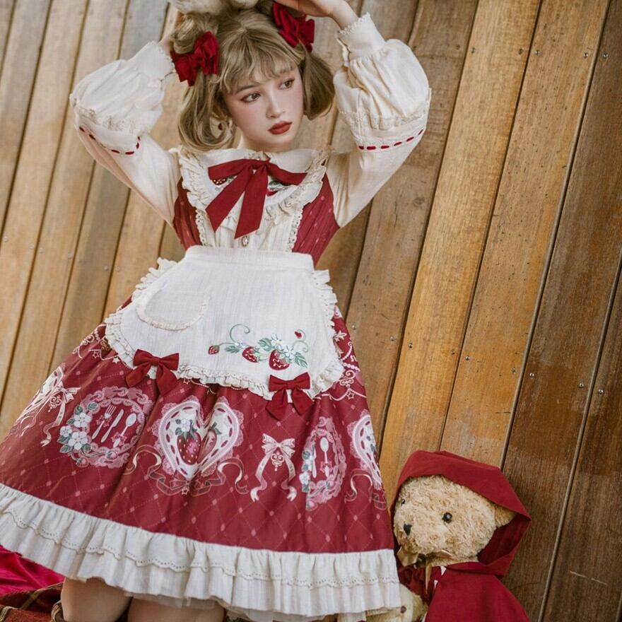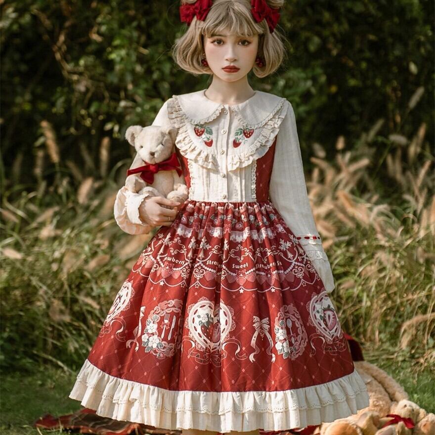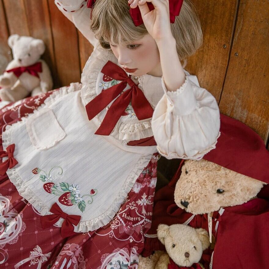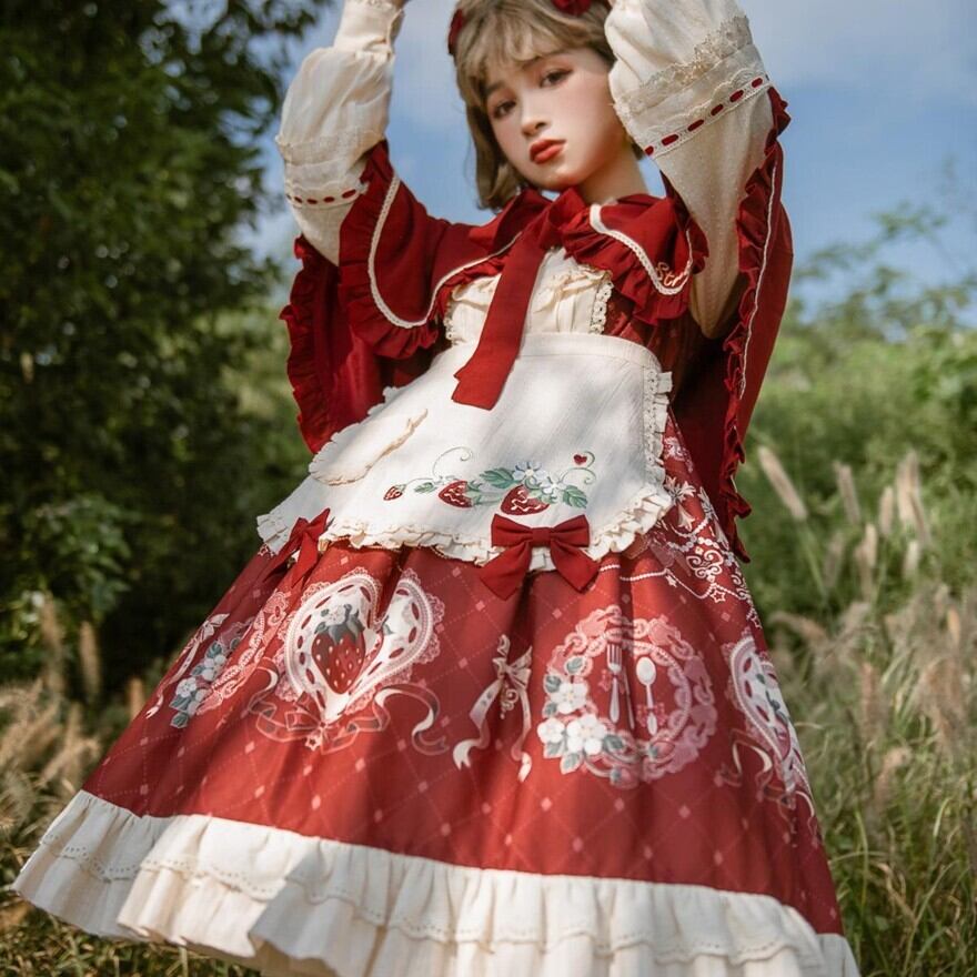 甘くてドーリーな雰囲気を存分に楽しめるセットアップ。ワンピースだけでも着用できますが、ケープを羽織ることで、まるでおとぎ話の主人公のような装いが完成します。いちご狩りや、可愛らしいカフェでのランチ、友人とのアフタヌーンティーなど、特別な日のお出かけにぴったりです。白いヘッドドレスや、イチゴモチーフのアクセサリーなどを合わせると、より一層可愛らしさが引き立ちます。