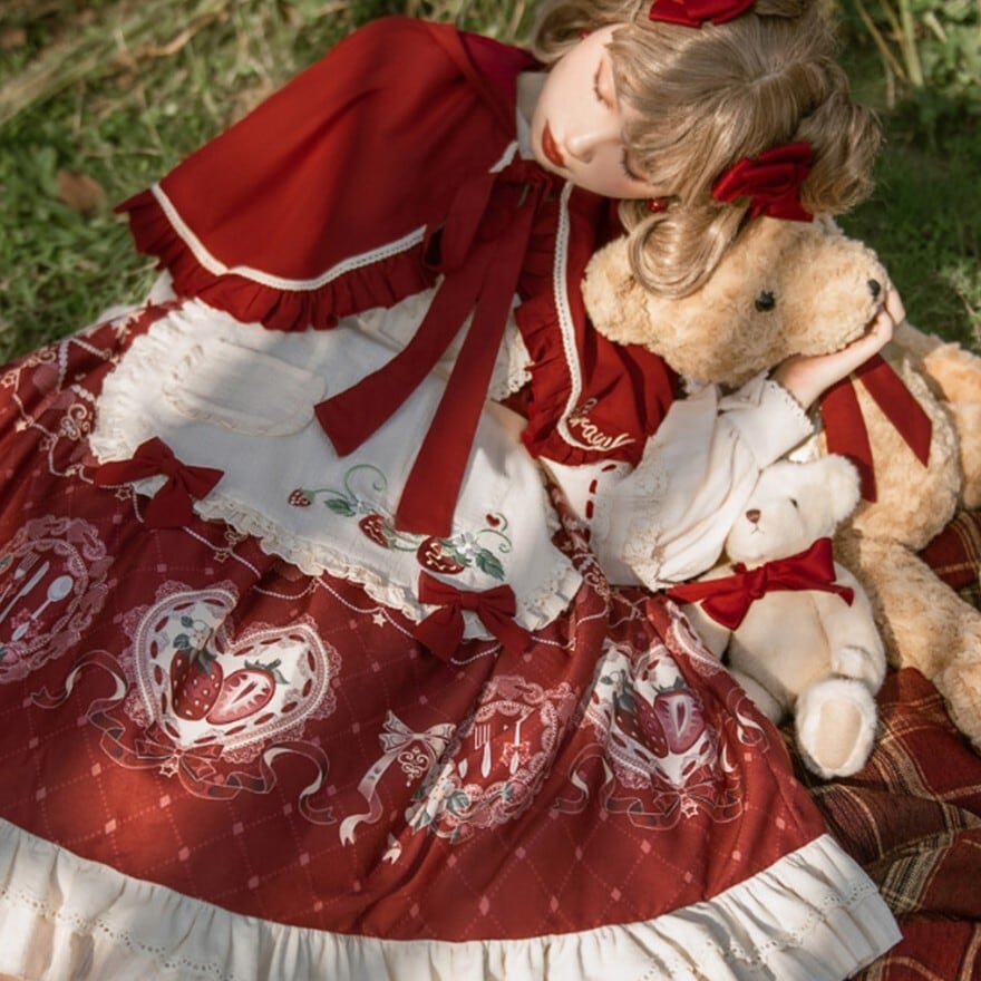 ボルドーとアイボリーの組み合わせが可愛らしい、長袖ワンピースとケープのセットです。ワンピースのスカート部分には、ストロベリーやリボン、ハートなどのプリントが全面に施されており、可愛らしい世界観を演出します。ブラウスのように見える上身頃と、エプロンのようなウエスト部分のデザインもユニークで魅力的です。ケープには、"Strawberry"の刺繍とフリルが施され、セットで着用するとさらに華やかさが増します。