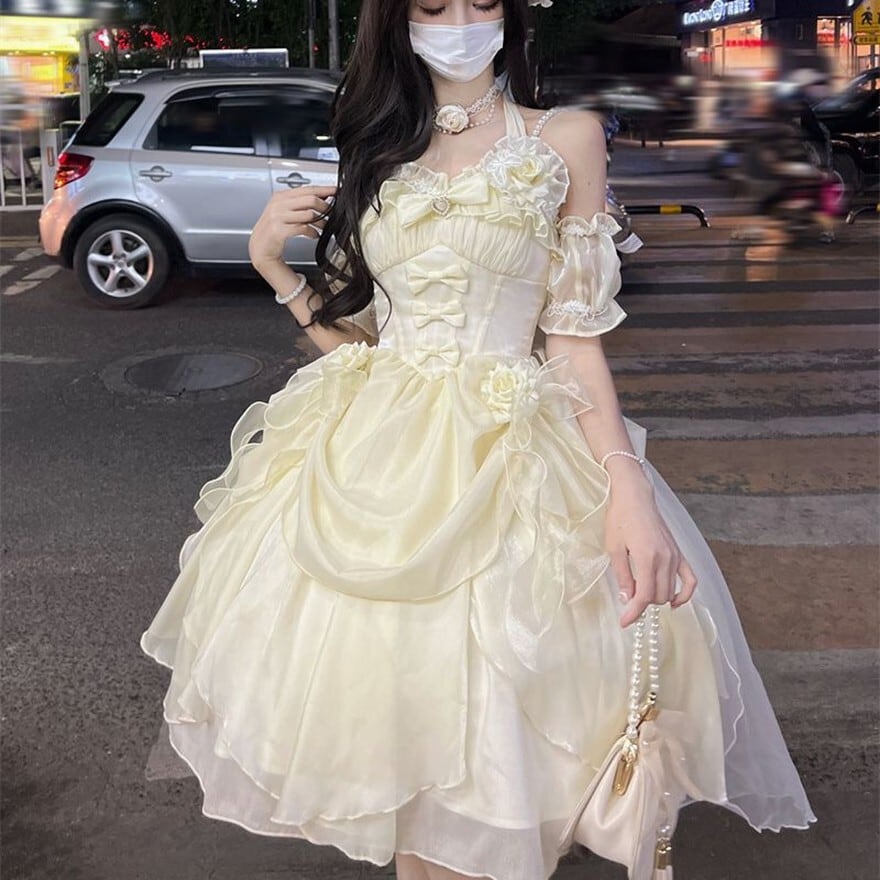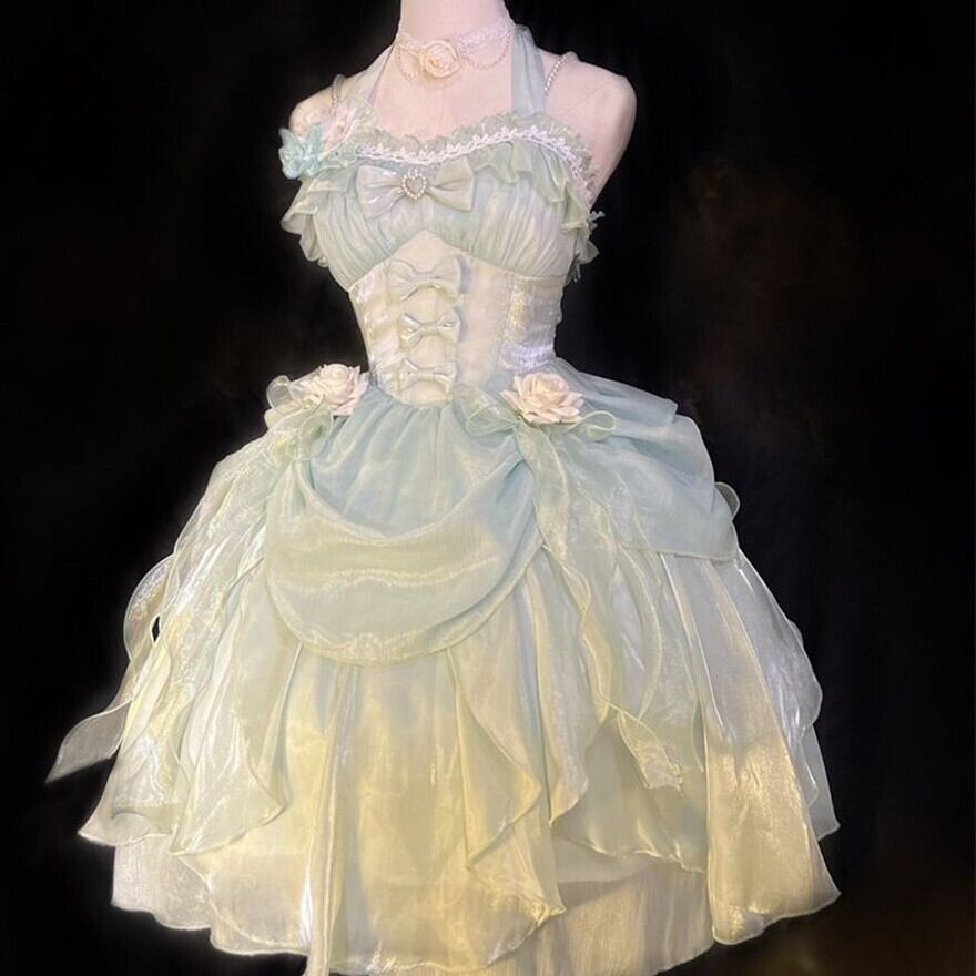 ライトグリーンとクリームイエローの2色展開で、光沢のあるオーガンジー素材がふんわりとした軽やかな印象を与えます。ビスチェ部分にはたくさんのリボンとバラのモチーフがあしらわれ、可愛らしいデザインです。スカートはランダムなティアードデザインとアシンメトリーな裾が特徴で、ドレープが優雅でロマンティックな雰囲気を演出します。