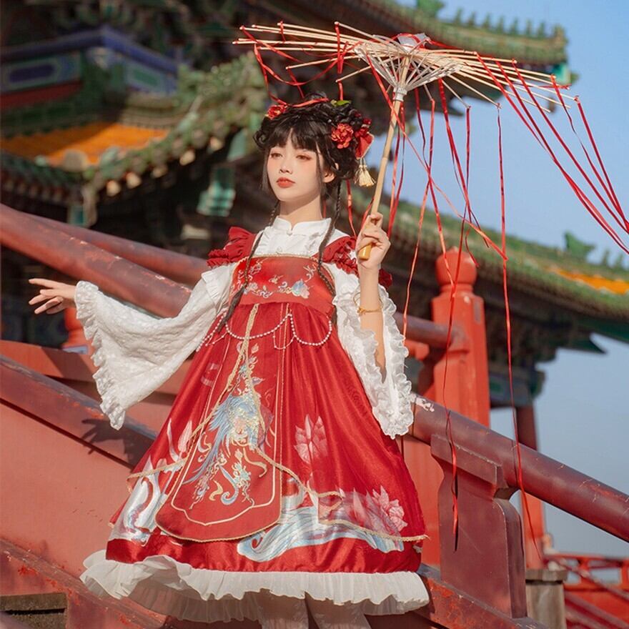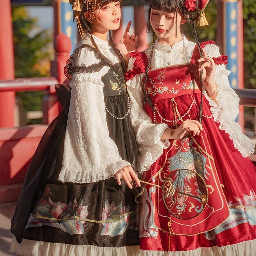 深みのあるレッドとシックなブラックの2色展開で、どちらも鳳凰や花々が描かれたオリエンタルな柄が特徴的です。胸元には鳳凰が大胆に描かれ、華やかで力強い印象を与えます。ウエスト部分には金色の鎖やパールがあしらわれ、豪華さを演出。ふんわりとしたスカートの裾には白いフリルが施されており、可愛らしいアクセントになっています。インナーのブラウスと合わせることで、より一層華やかな着こなしが楽しめます。