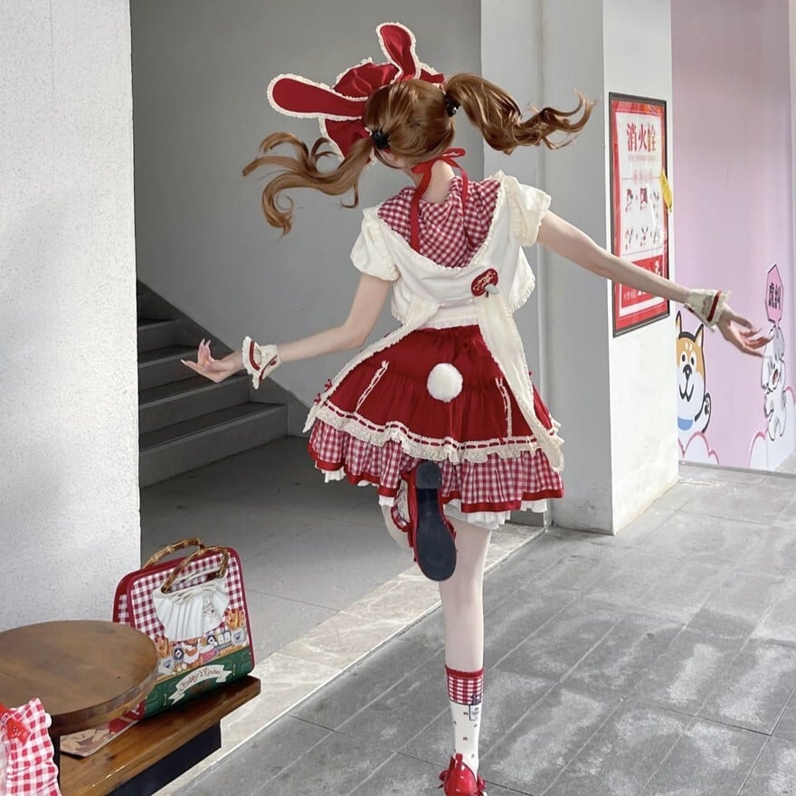 胸元には白い大きなボタン、スカート部分には白いふわふわのうさ耳モチーフ、りんごモチーフのリボンなど、細部にまでこだわりが詰まっています。