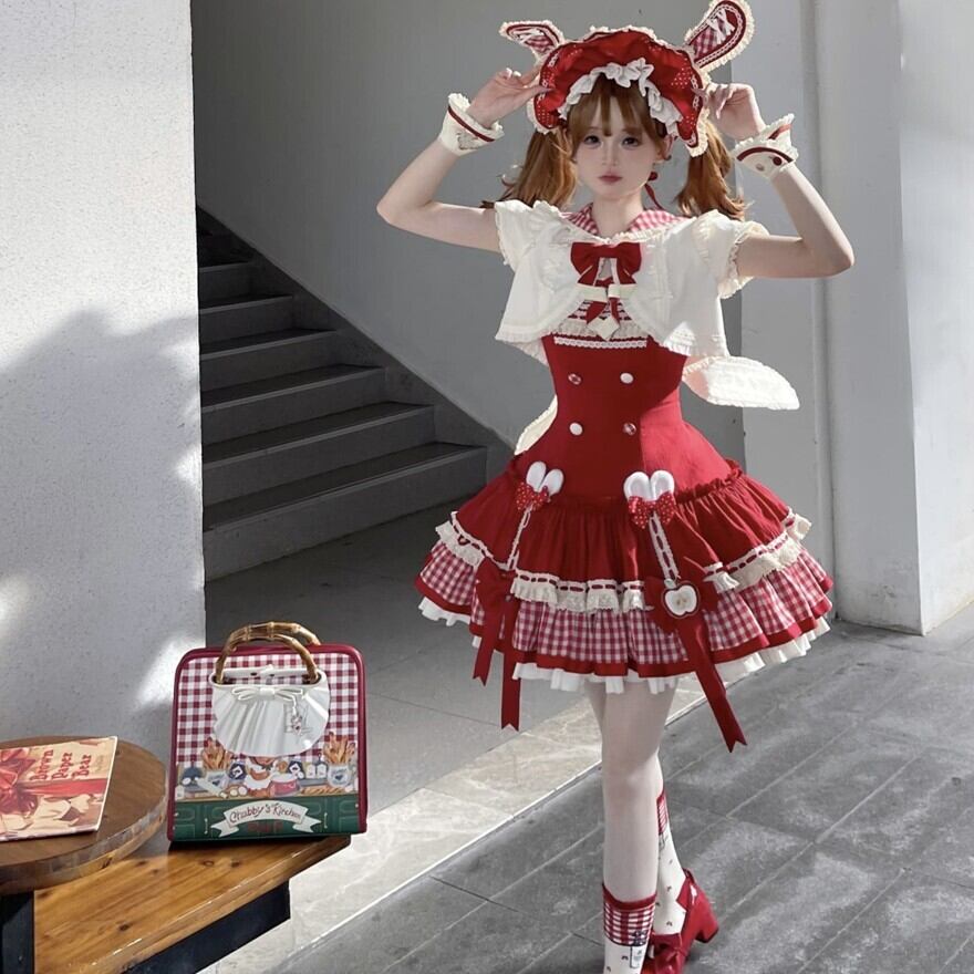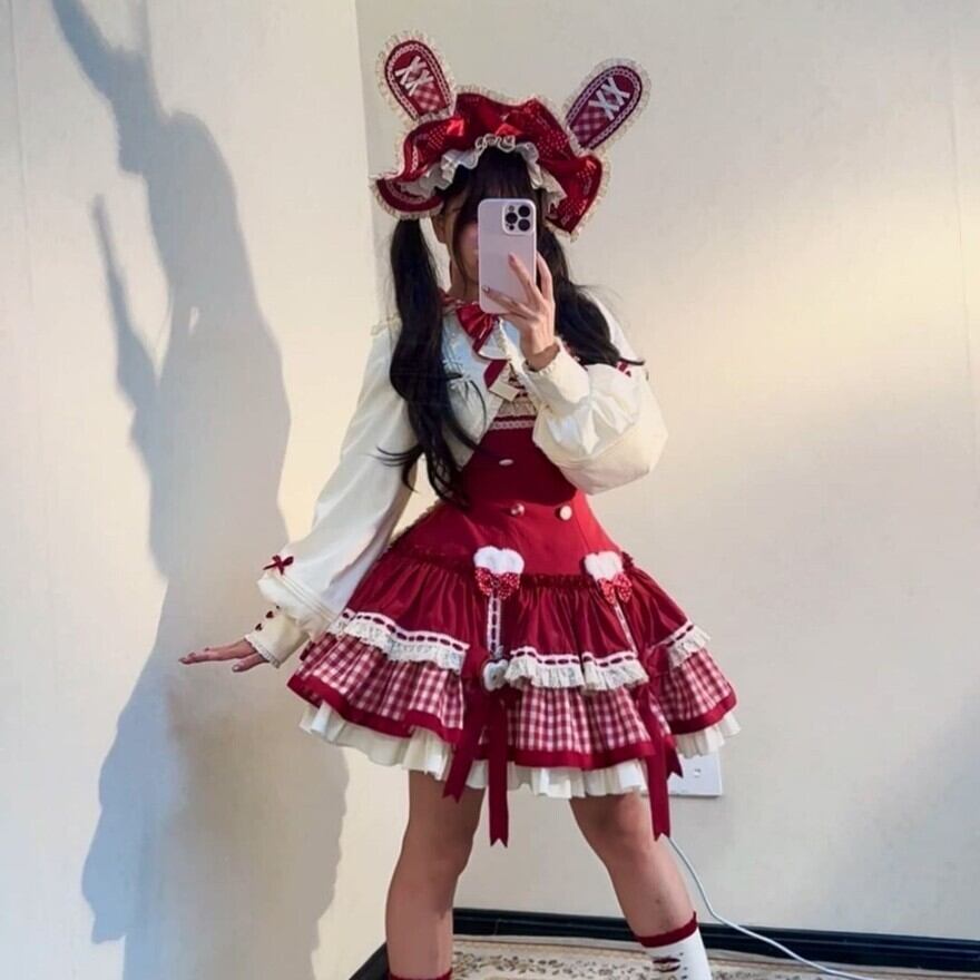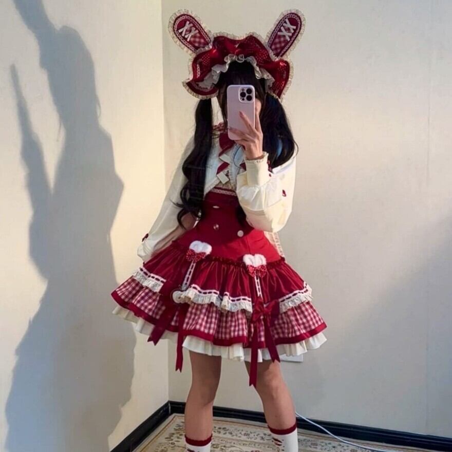 赤のドット柄とギンガムチェック、そしてたっぷりのフリルやリボン、レースが組み合わされており、非常に凝った作りになっています。