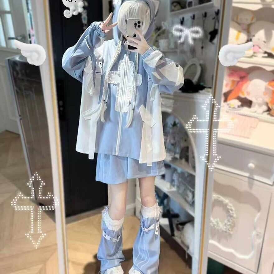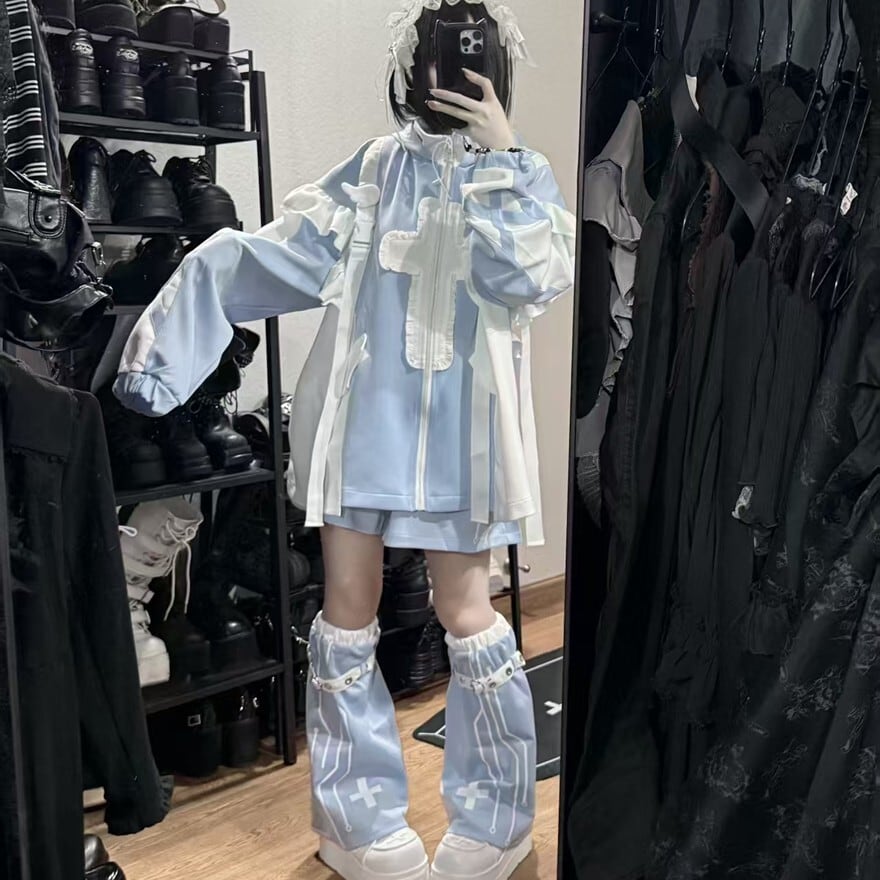 水色と白のバイカラーデザインに、プリントやフリル、ベルトなどのディテールが施された、個性的なセットアップです。ジャケット、ハーフパンツ、レッグウォーマーの3点がセットになっています。