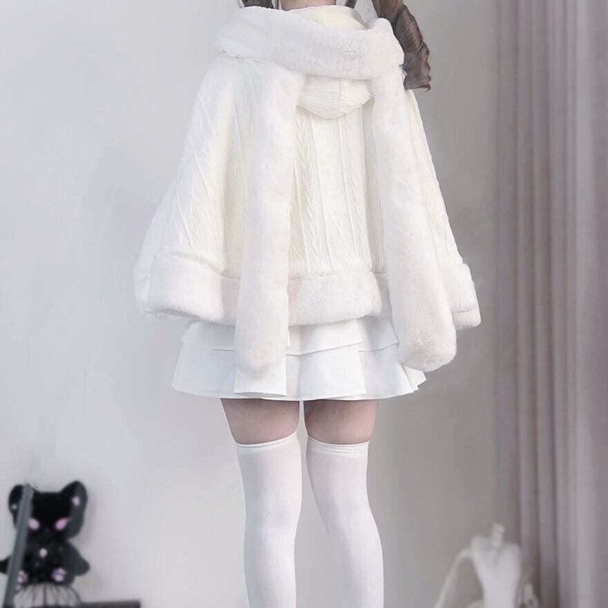 フードにあしらわれた長いうさ耳と、袖口や裾、フード周りにたっぷり使用されたふわふわのファーが特徴のケープコートです。