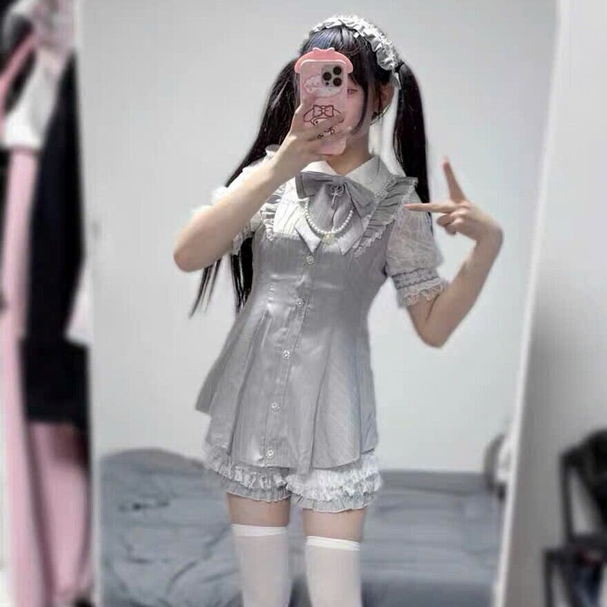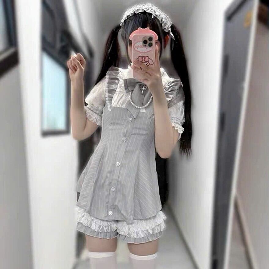 半袖のレース付きブラウスと、細いストライプ柄のジャンパースカート風トップス、そして裾にレースフリルをあしらったショートパンツからなる、甘くドーリーなセットアップです。