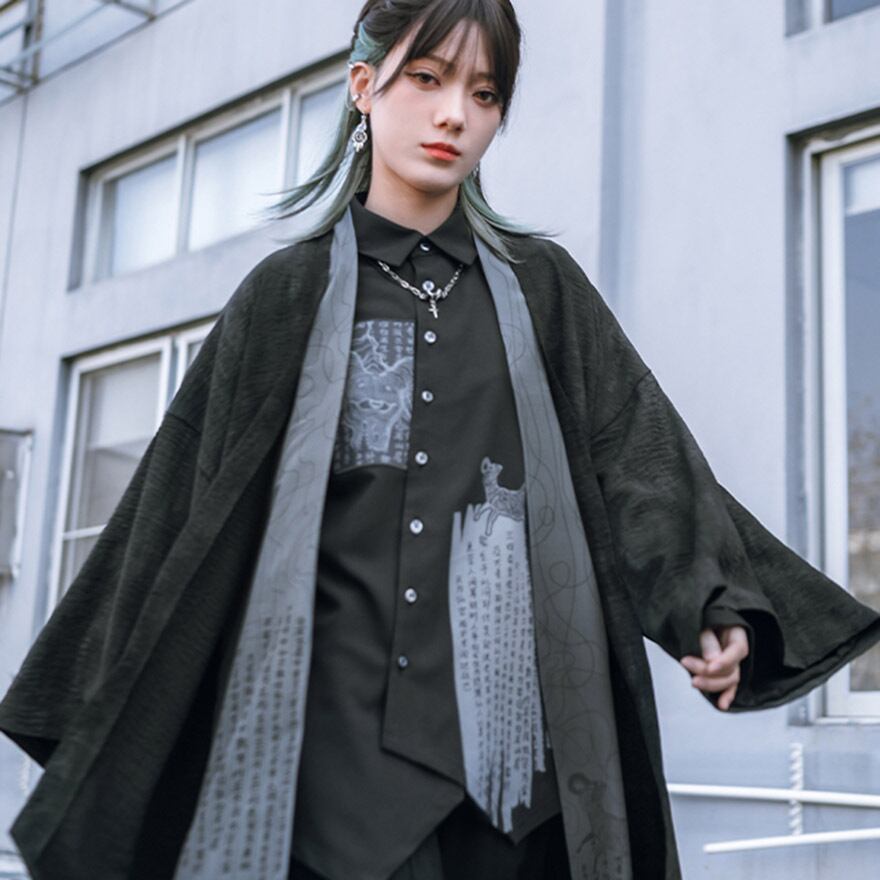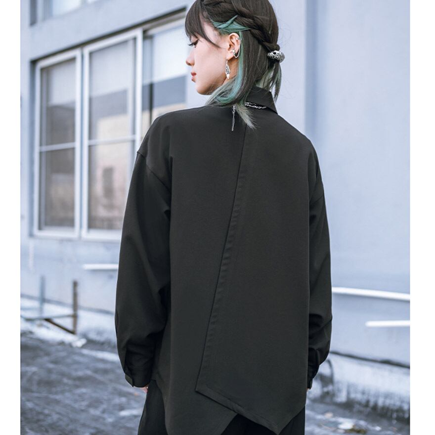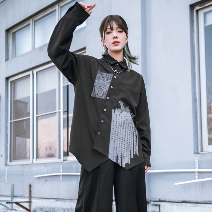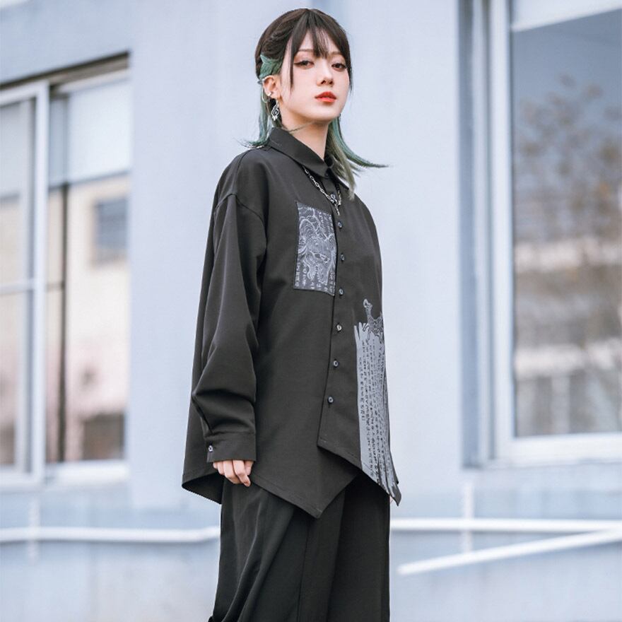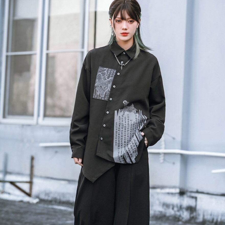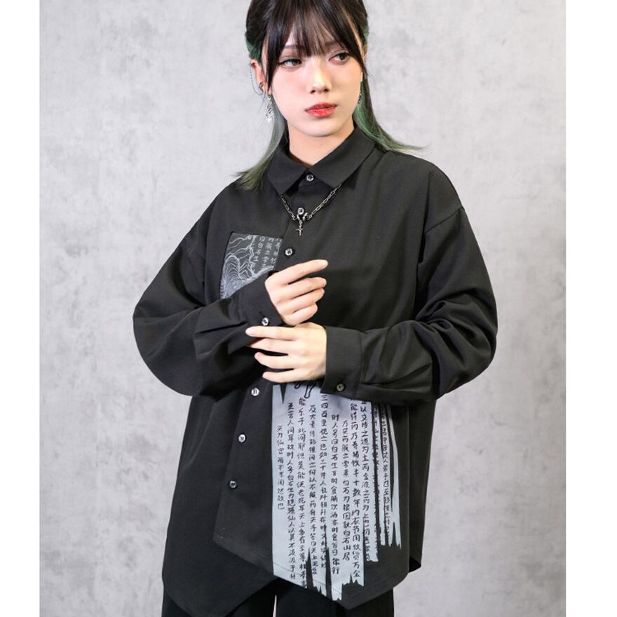 関連キーワード: #デザインシャツ #モード系 #ストリートファッション #サブカル #中華風 #アシンメトリー #漢字 #プリントシャツ #個性的 #ユニセックス #黒シャツ #オーバーサイズ