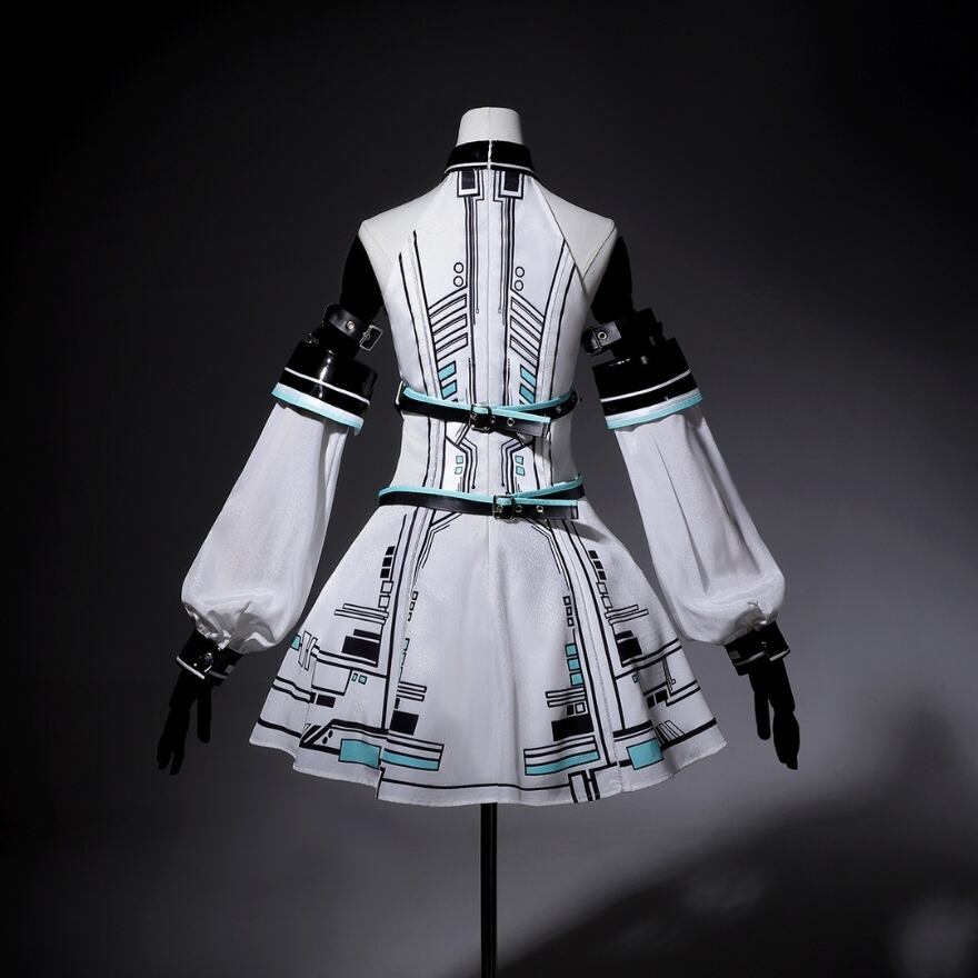 アームカバーは、指先までカバーするデザインで、腕に施された電子回路のプリントがサイバーな雰囲気を強調。ヘッドバンドは、リボンのようなデザインに回路柄がプリントされており、コーディネート全体を統一感のあるものに仕上げます。